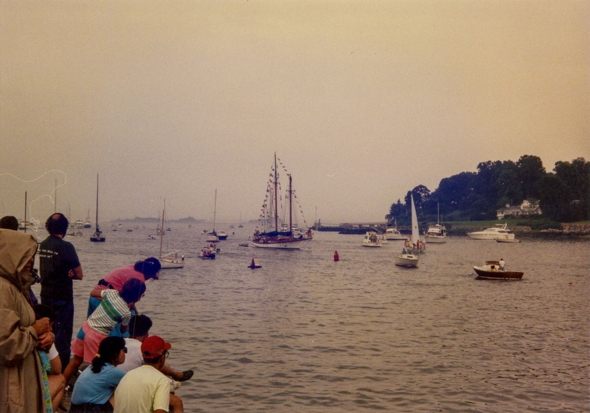Tall ships and the Island Beach Ferry in a show celebrating the 350th Anniversary of Greenwich's founding.Collection
