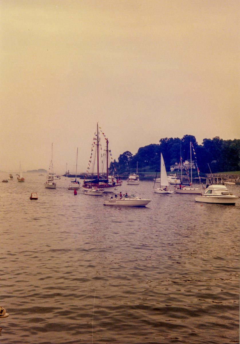 Tall ships and the Island Beach Ferry in a show celebrating the 350th Anniversary of Greenwich's founding.Collection