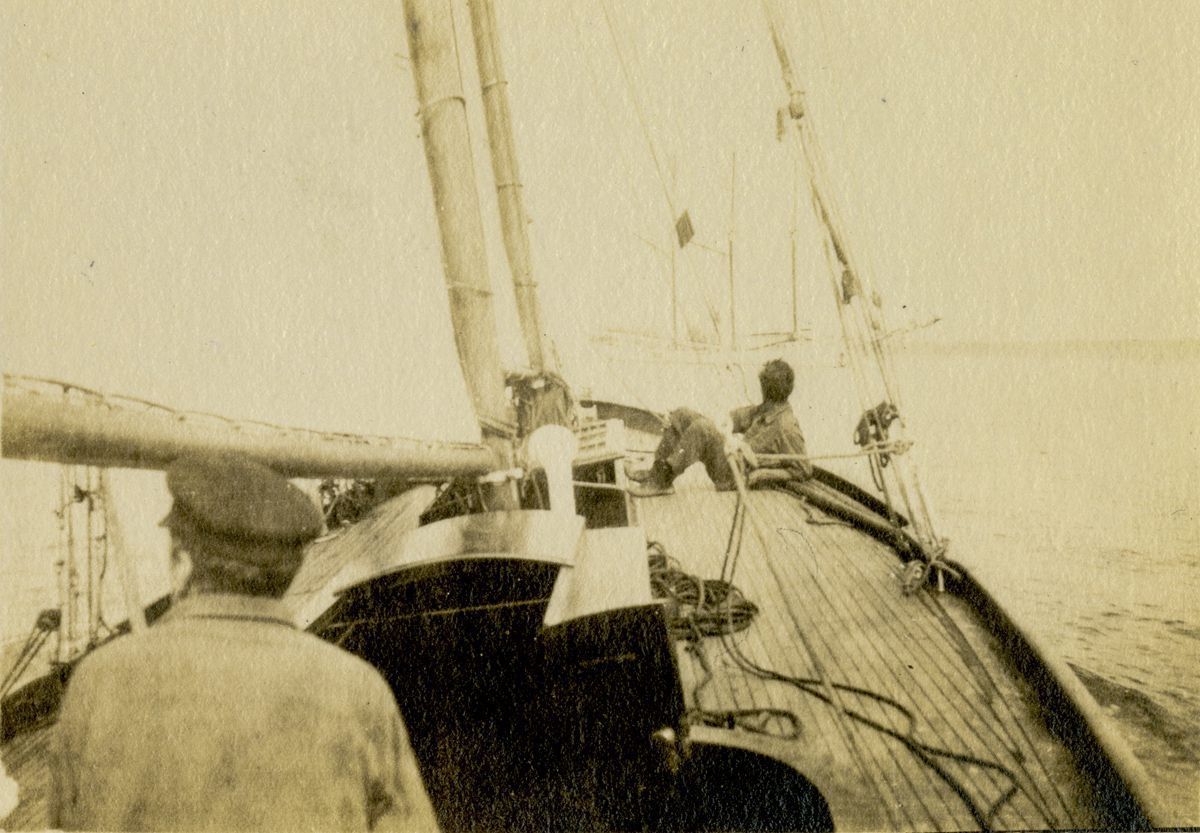 Various angles of the sailboat "Wanda," including some of her deck with passengers onboard.