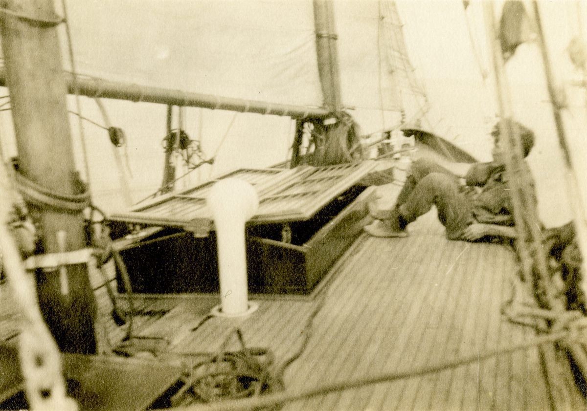 Various angles of the sailboat "Wanda," including some of her deck with passengers onboard.