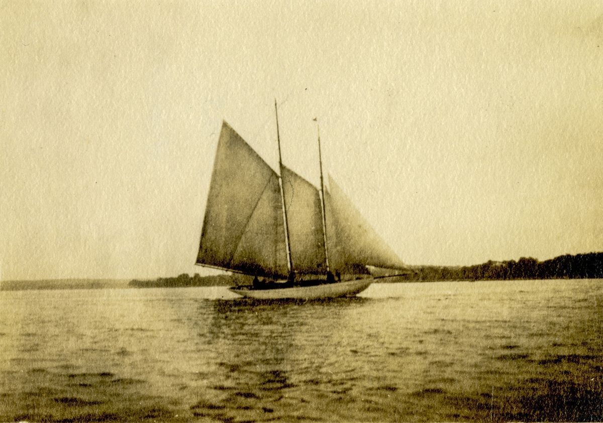 Various angles of the sailboat "Wanda," including some of her deck with passengers onboard.