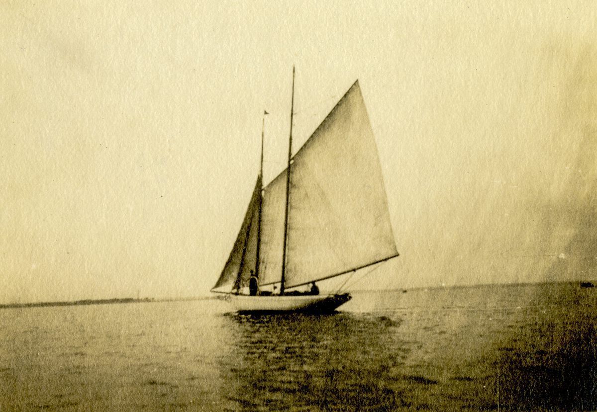 Various angles of the sailboat "Wanda," including some of her deck with passengers onboard.