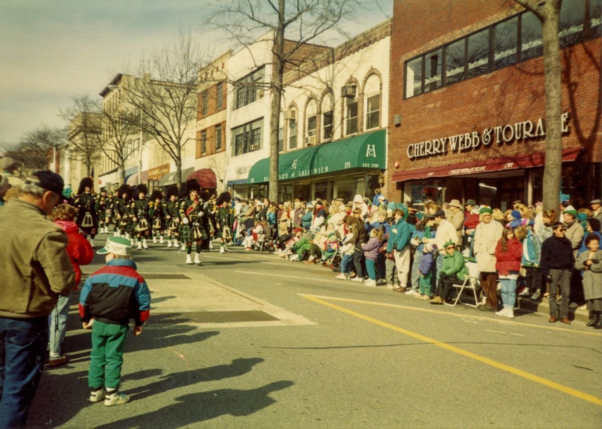 Images of a Saint Patrick's Day parade on Greenwich Avenue.