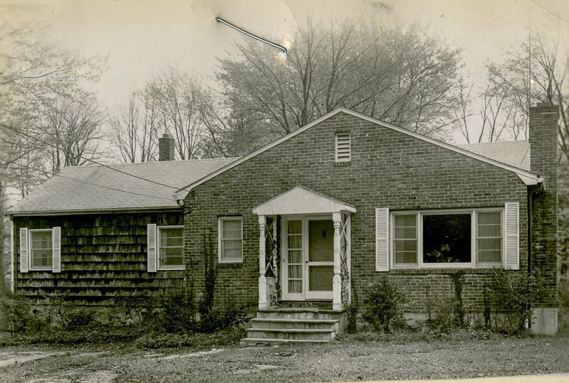 House built in 1958 with brick walls and shingle siding viewed from its lawn.