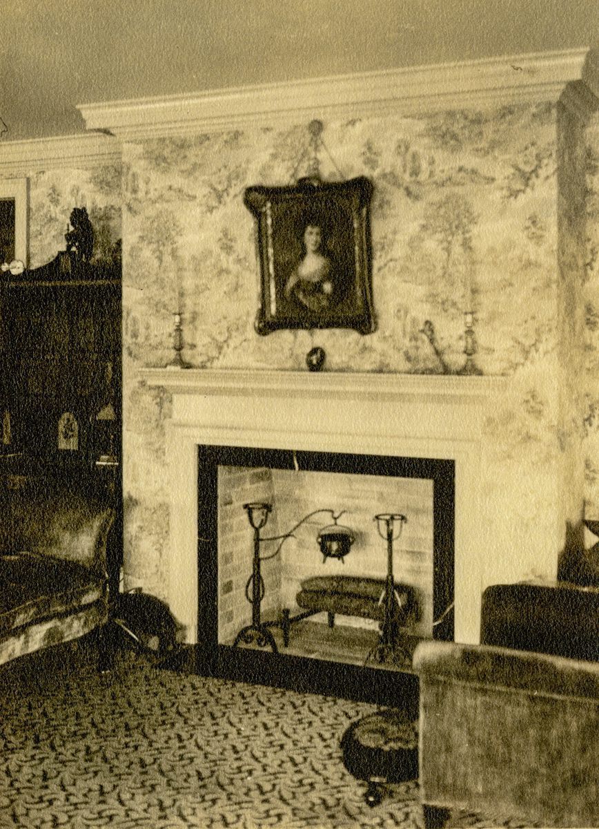 View of a fireplace with a portrait of a woman hanging above it.