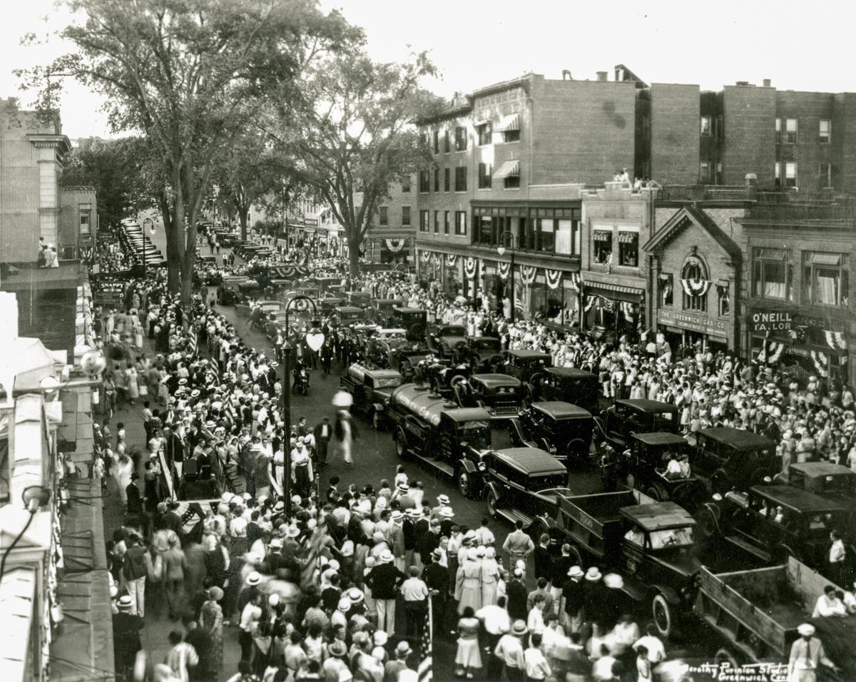Crowds of people watching cars and trucks parade along Greenwich Avenue shortly after it was widened to hold more traffic.Collection