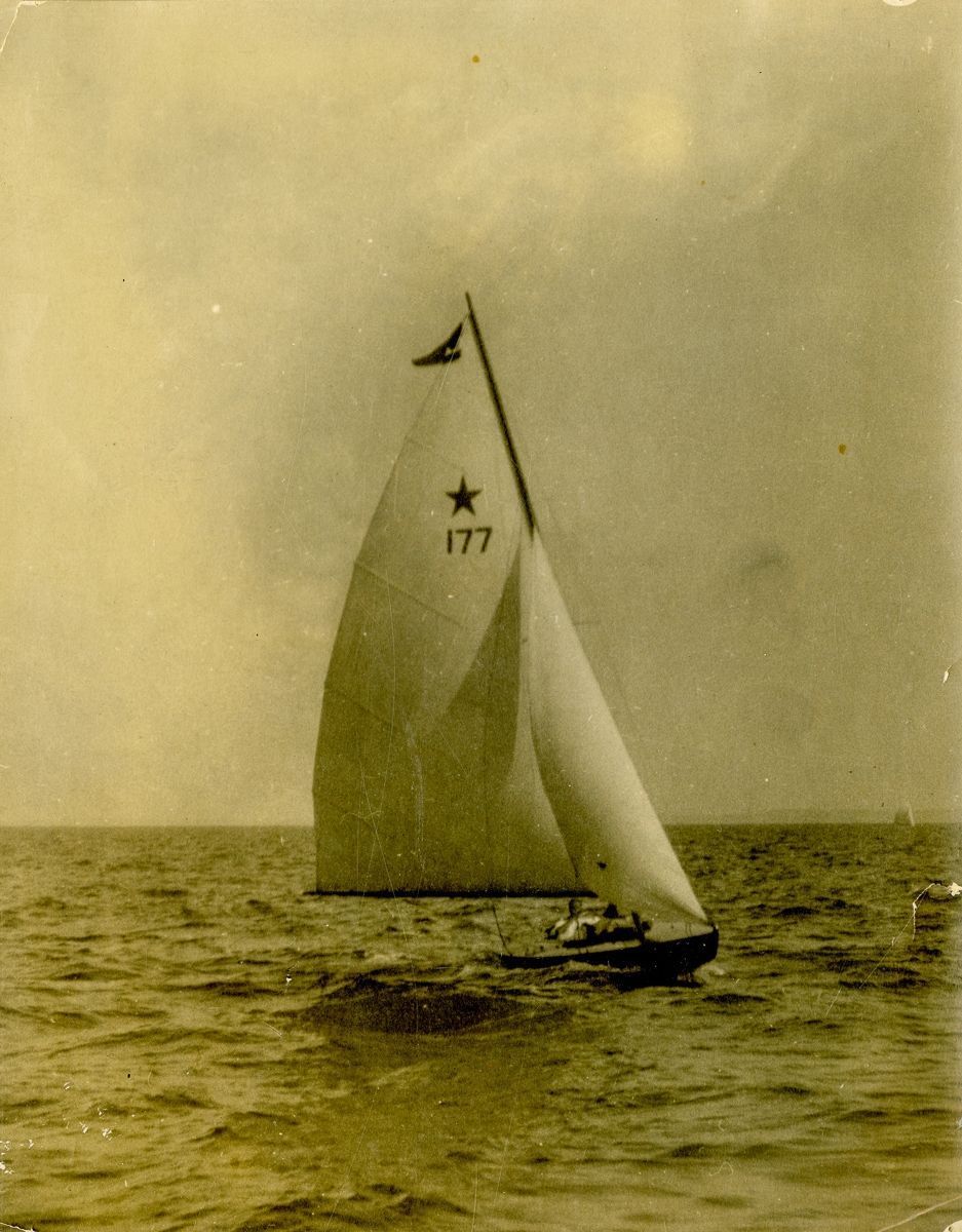 A "Star class" boat sailing on the Sound with a crew member in the middle of the hull.