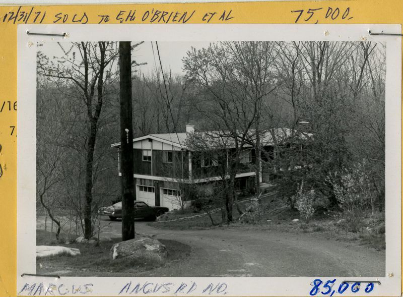 Contemporary house built in 1968 with wooden siding and a car parked in front of its two door garage viewed from the top of its driveway.Collection