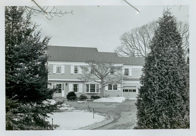 Colonial-style house built in 1954 viewed from its driveway.