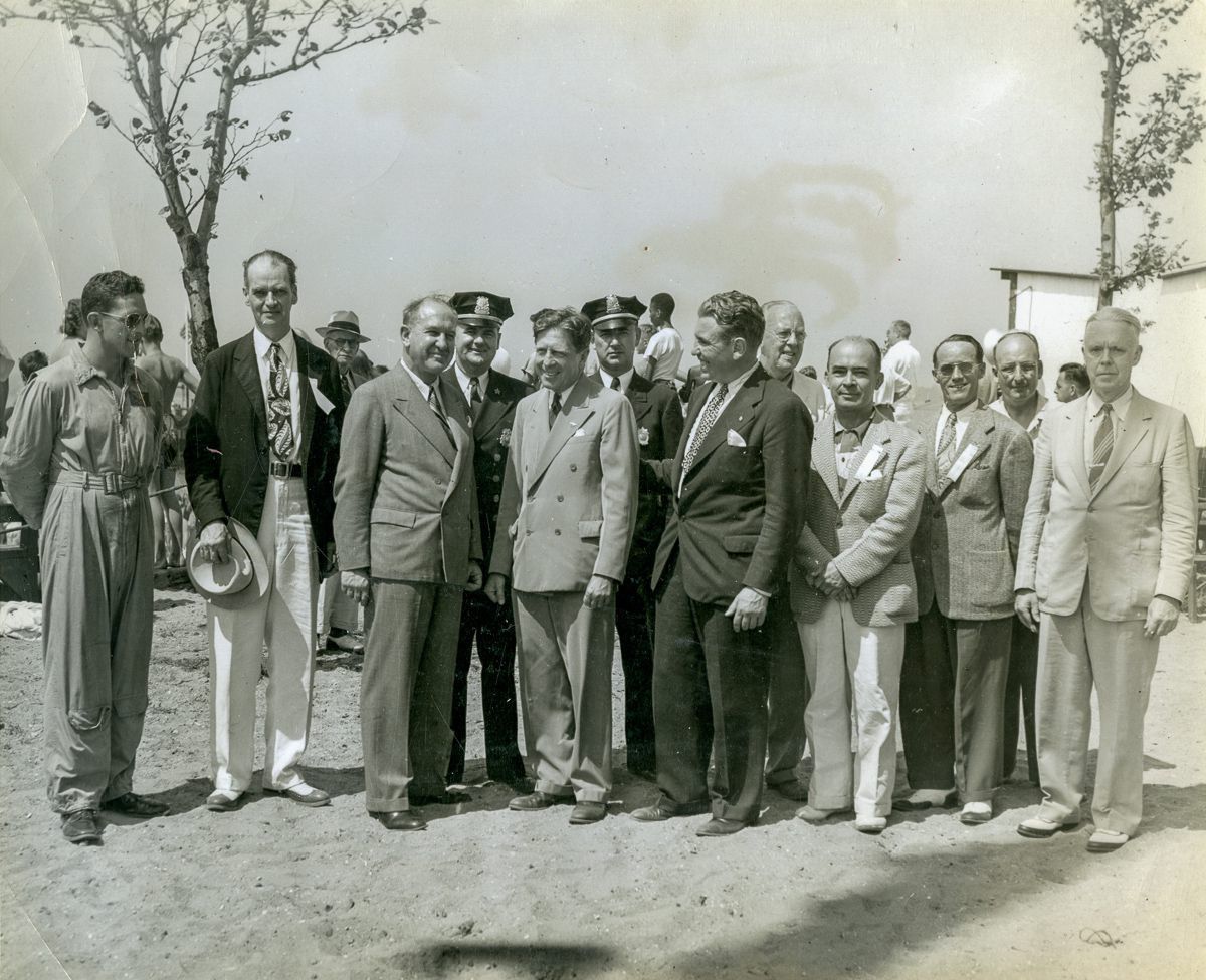 A group of men including the Police Chief James Gleason and First Selectman Wilbur Peck posing on Island Beach Day.Collection