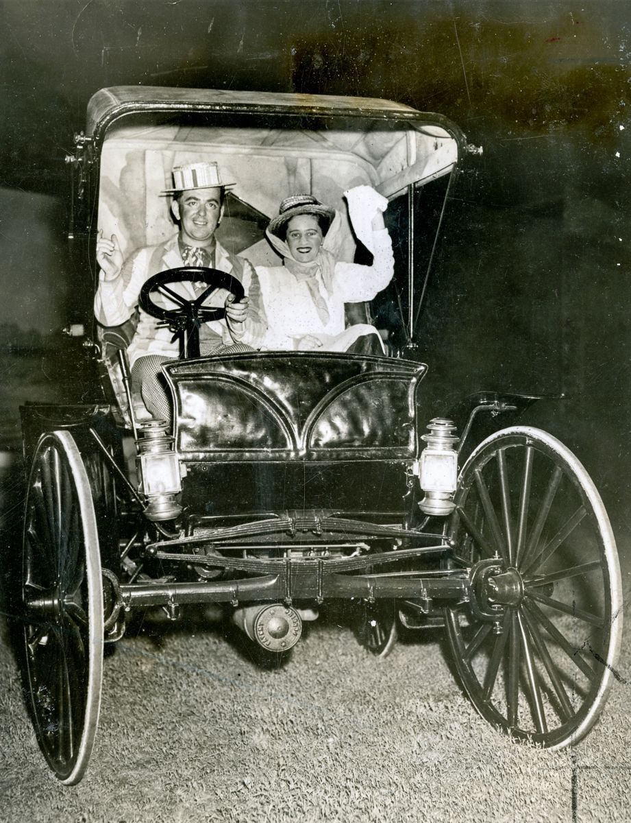 Moe and Marion Tunick in a car from 1897 during an event celebrating the 300th Anniversary of the Founding of Greenwich.Collection