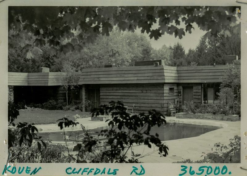 Contemporary house built circa 1977 with a mansard roof and wooden siding viewed from next to its pool.Collection