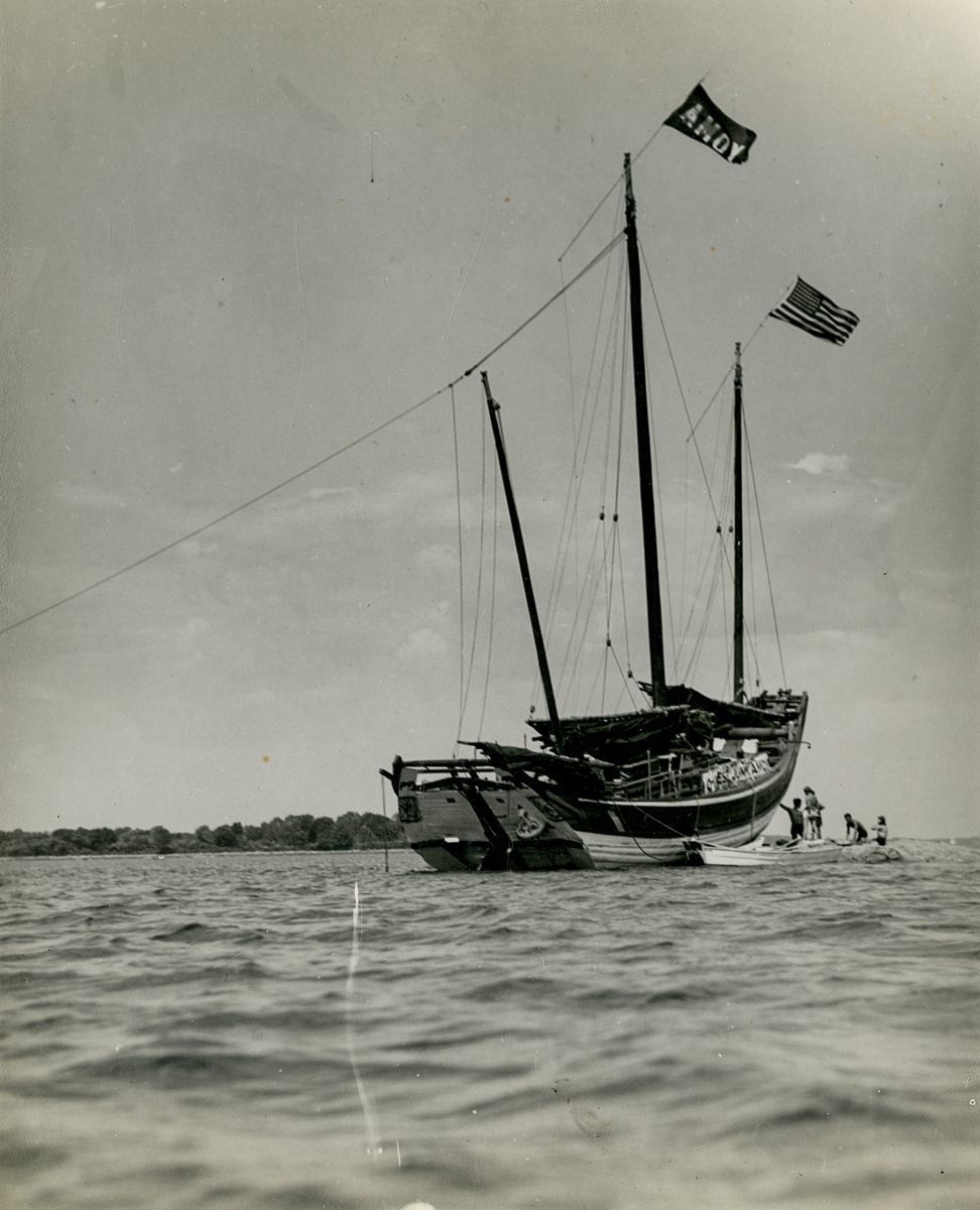 A Chinese junk, the "Amoy" in the waters of Greenwich Harbor; a group of people are on a rock by the boat.