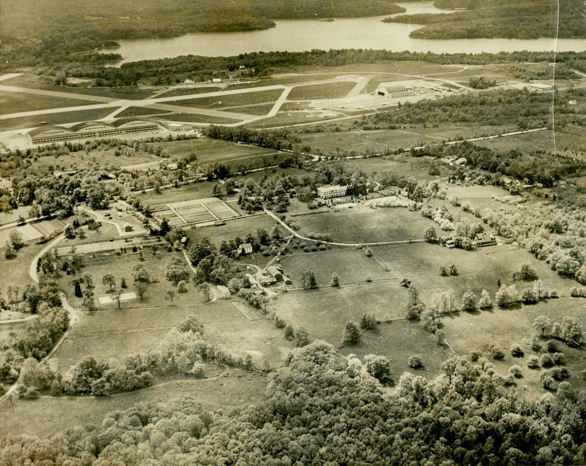 Aerial view of James Steers's estate, Faircroft, on King Street across from the Westchester County Airport. Rye Lake is behind the airport. The estate included farm fields and buildings, including the farmhouse occupied by Fred Fields, the previous owner, who continued to manage the property for the Steerses. The original estate house, built in 1095, was rebuilt in 1925 after a fire. Later owners of the estate included Claire Booth Luce and Avco Corporation, which located it's corporate headquarters there.Collection