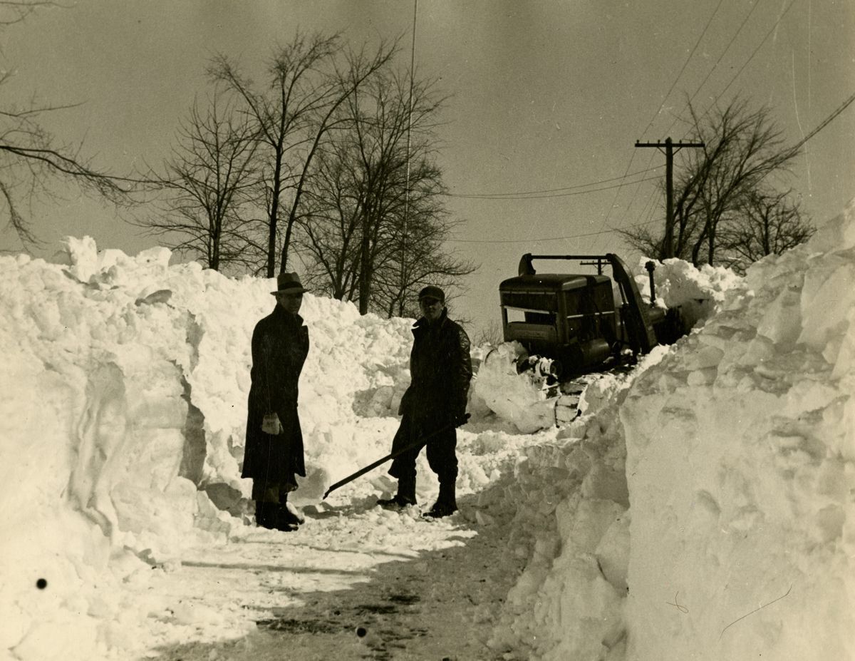 Two men shoveling snow with a snowplow with tracks behind hem in December 1947.