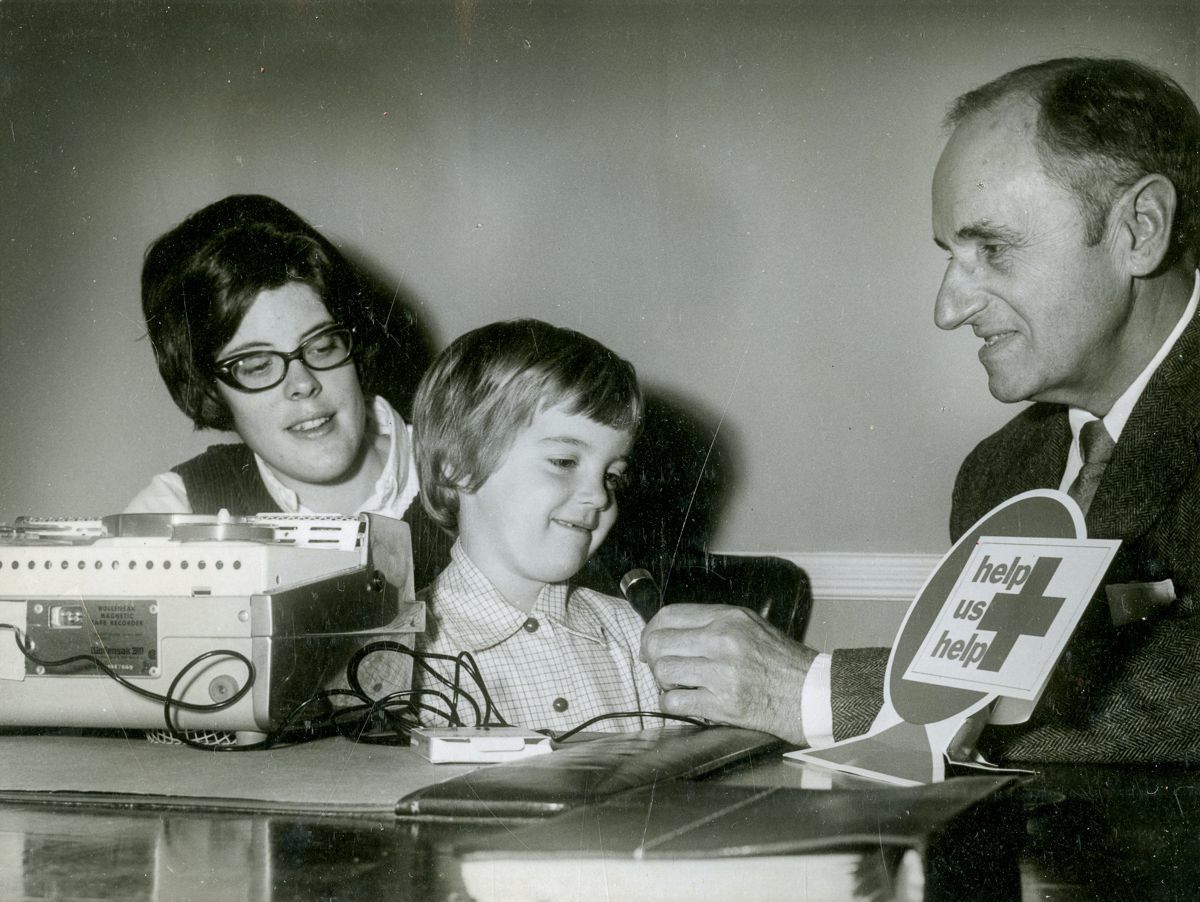 A man holding up a tape recorder's microphone to a child during a Red Cross campaign event.Collection