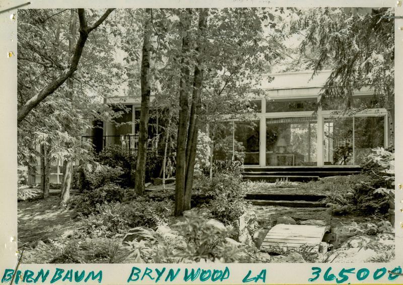 Contemporary house built in 1969 with glass walls viewed from its garden.