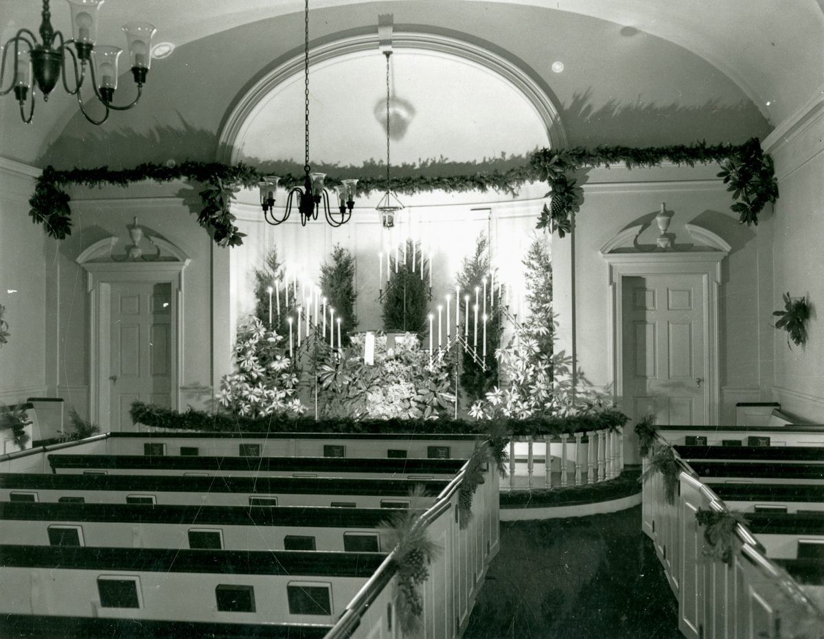 The interior of the First Church of Round Hill, looking towards the pulpit which is decorated for Christmas.Collection