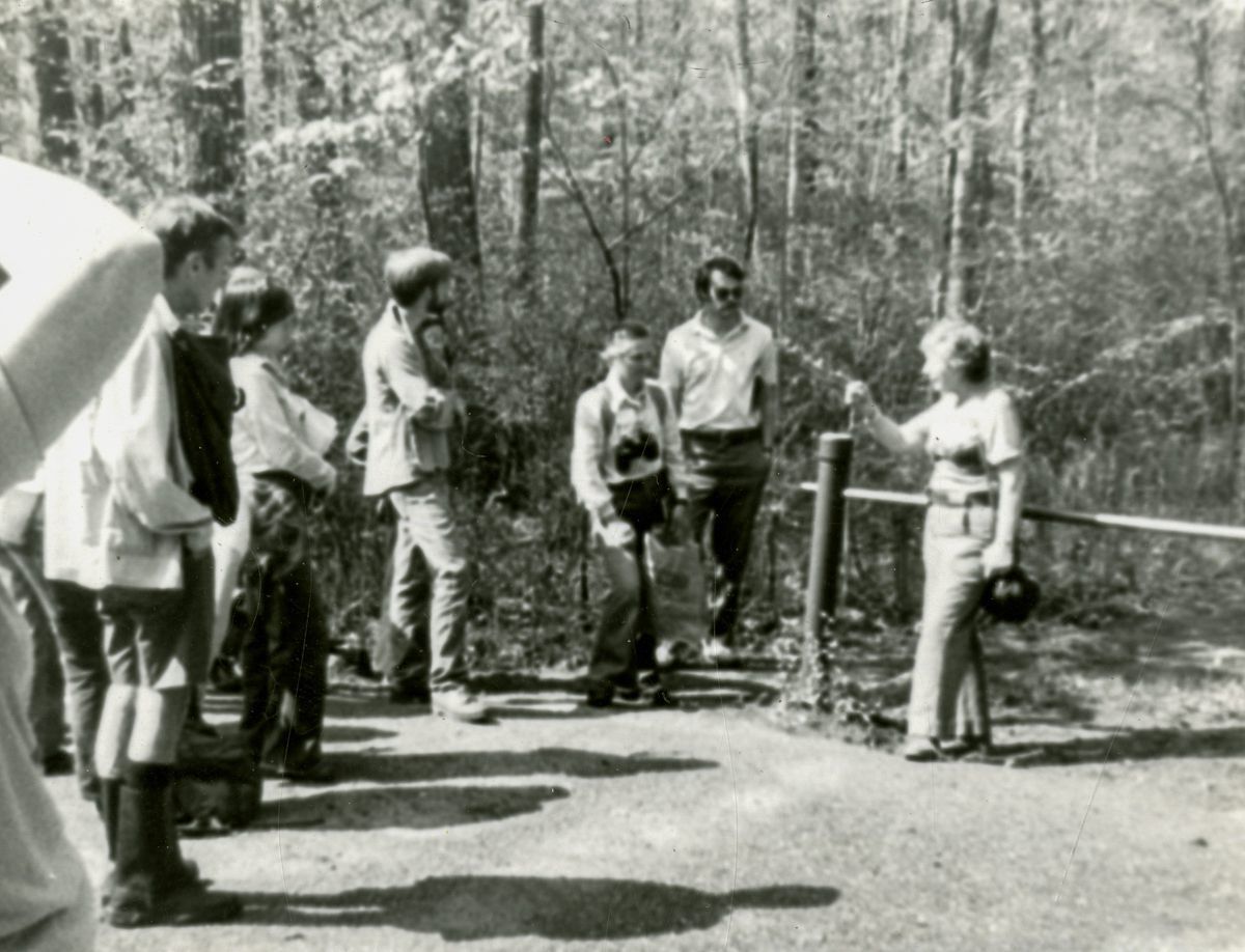 People attending an Audubon Center course outside, being led by a guide.