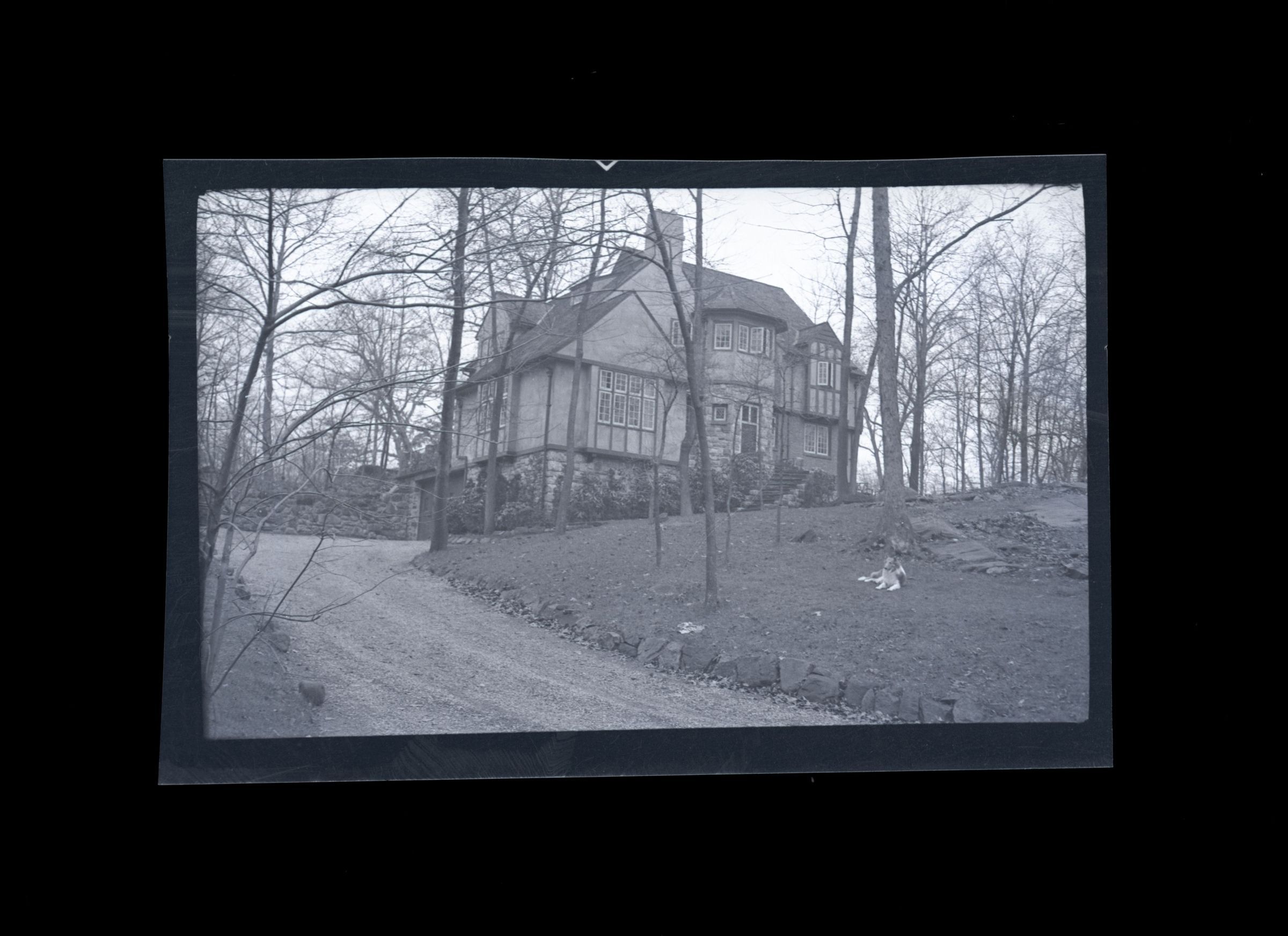 A view of a three story house from its driveway. A dog is laying on the lawn next to the driveway.Collection