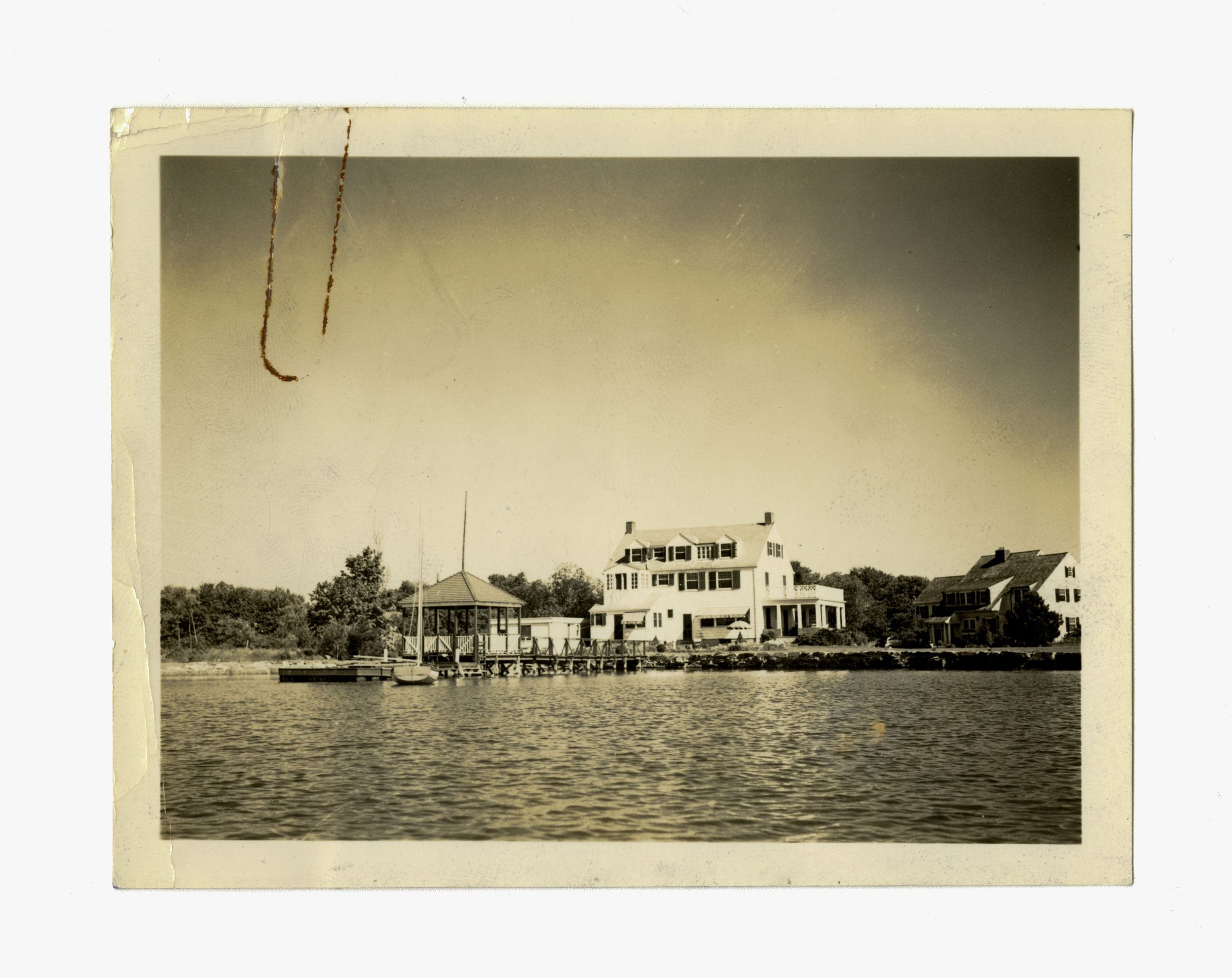 A view from the water of a three story house with a dock; a small sailboat is moored at the dock.Collection
