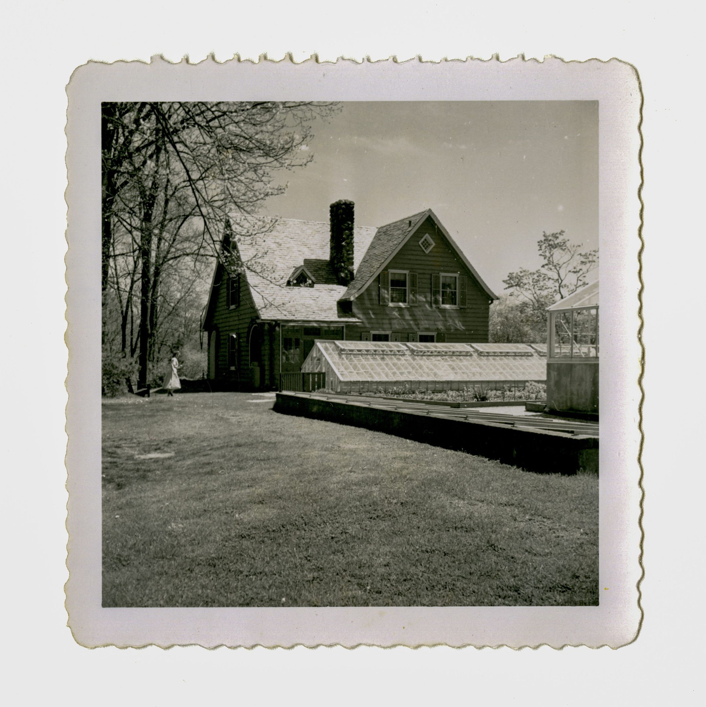 A view from the lawn of a three story house and its greenhouse. A girl is walking toward the house on the left side of the image.Collection