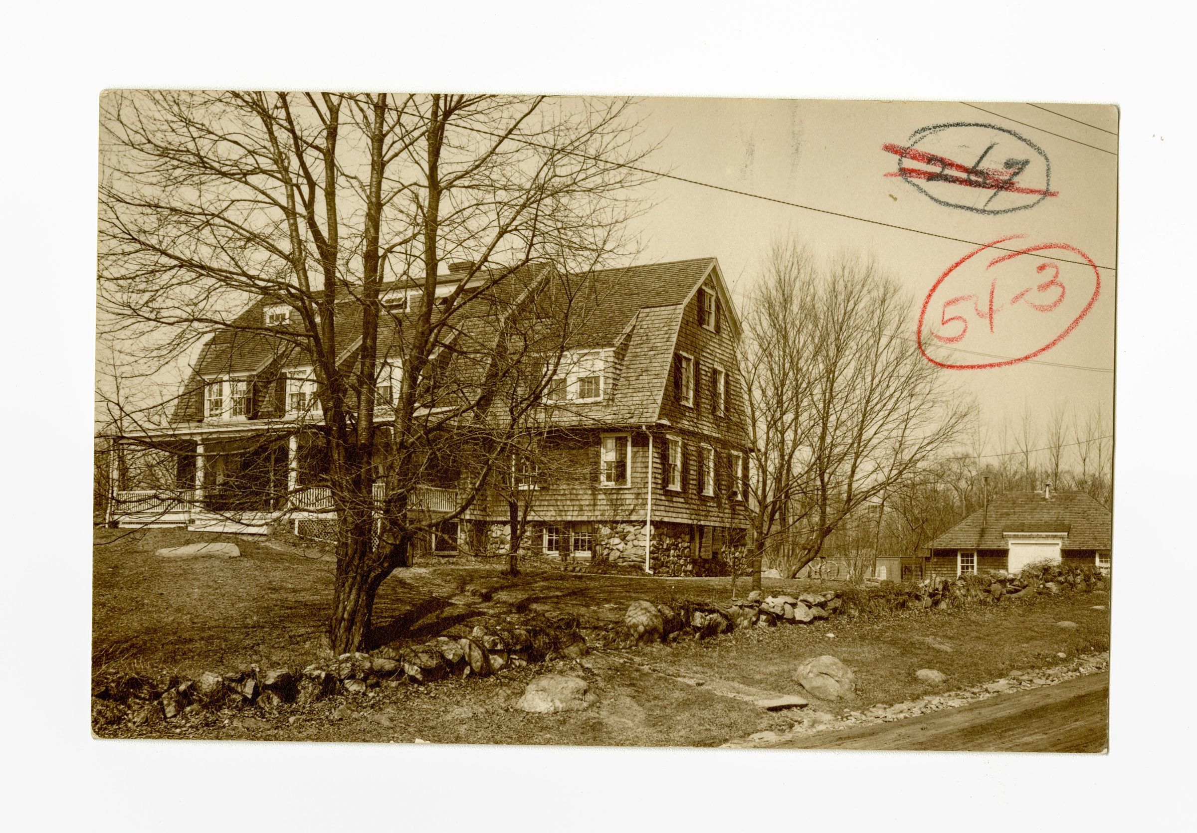 A three story shingle house with dormers and a gambrel-style roof.Collection