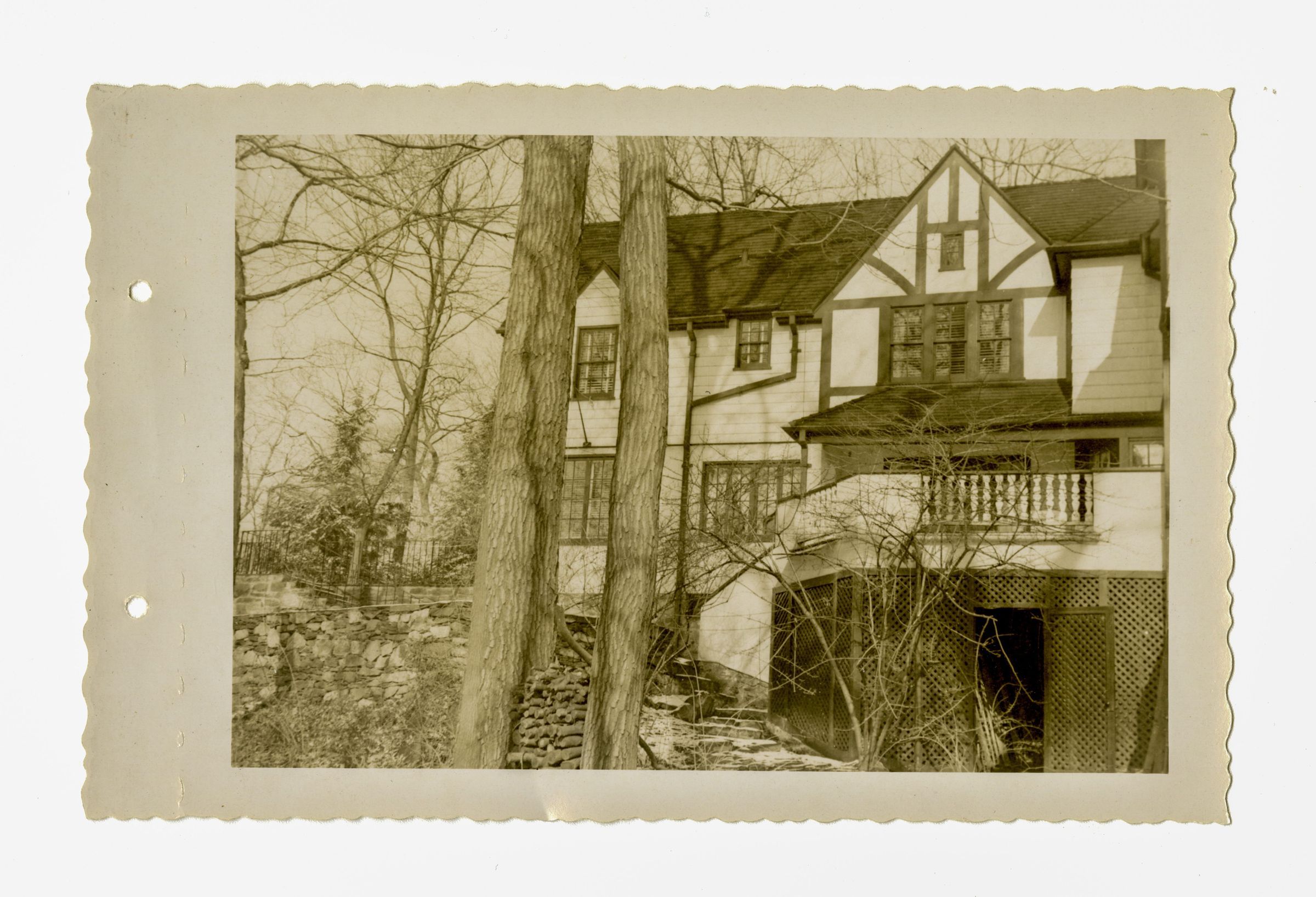A two story house with a trellis covered area under a terrace.
