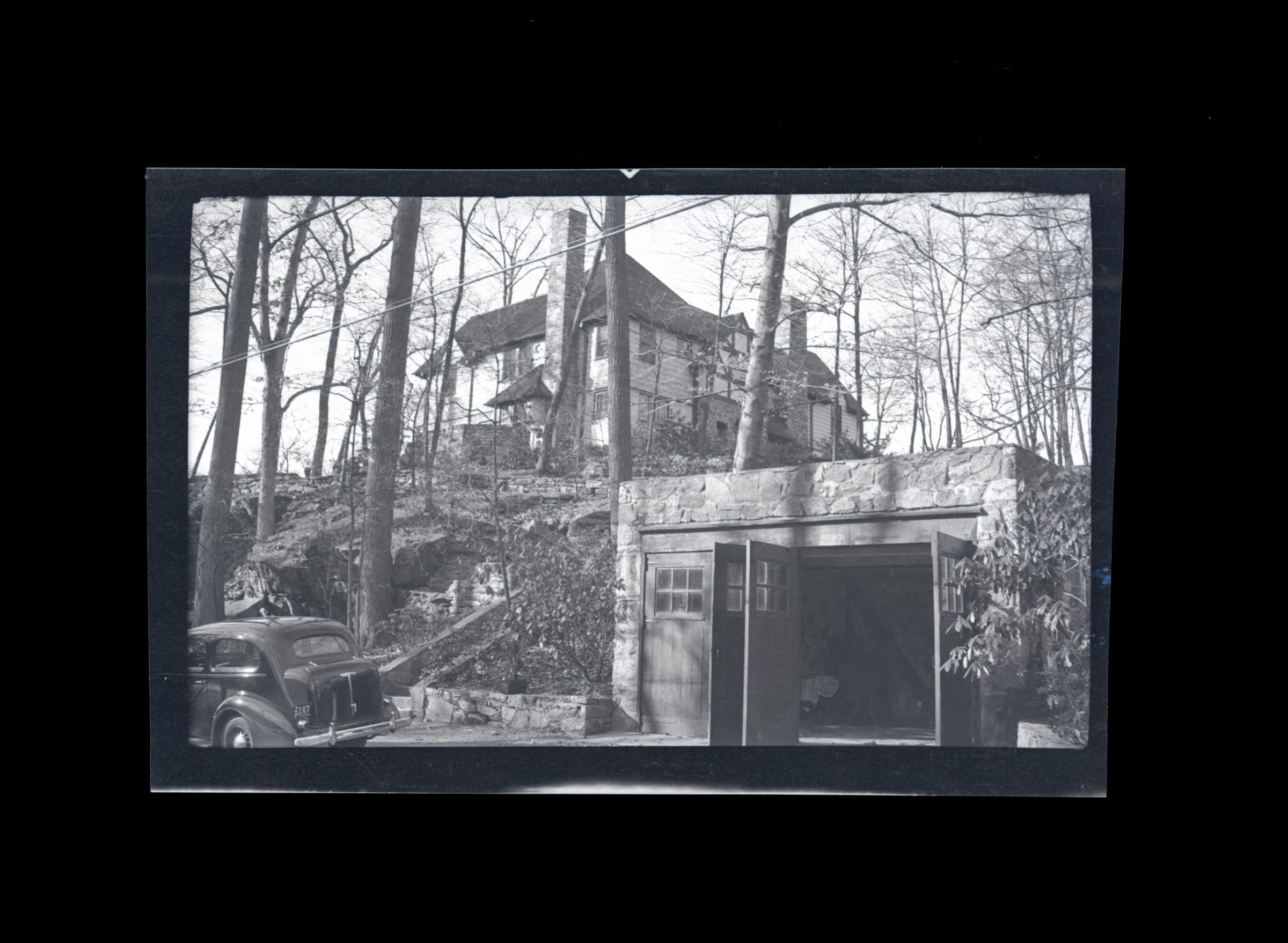 A house at the top of a hillside with a garage in the foreground of the image at the bottom of the hill and a car parked on the left side of the image.Collection