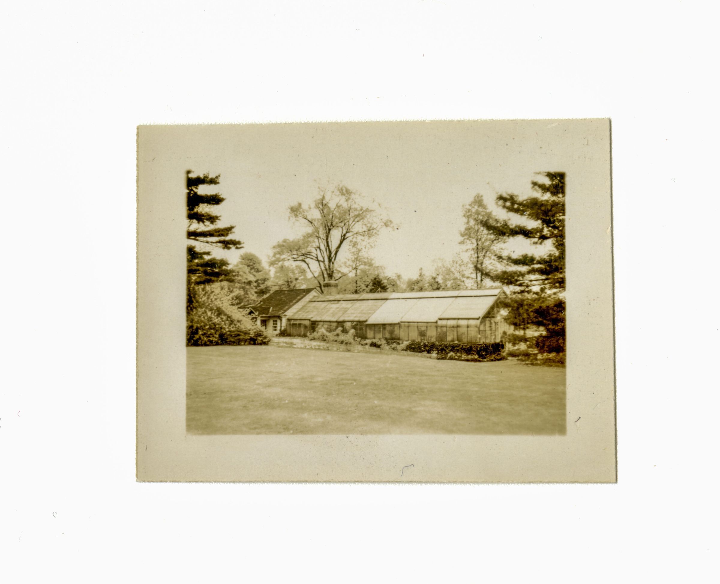 A greenhouse with an attached shed/cottage in the lawn.