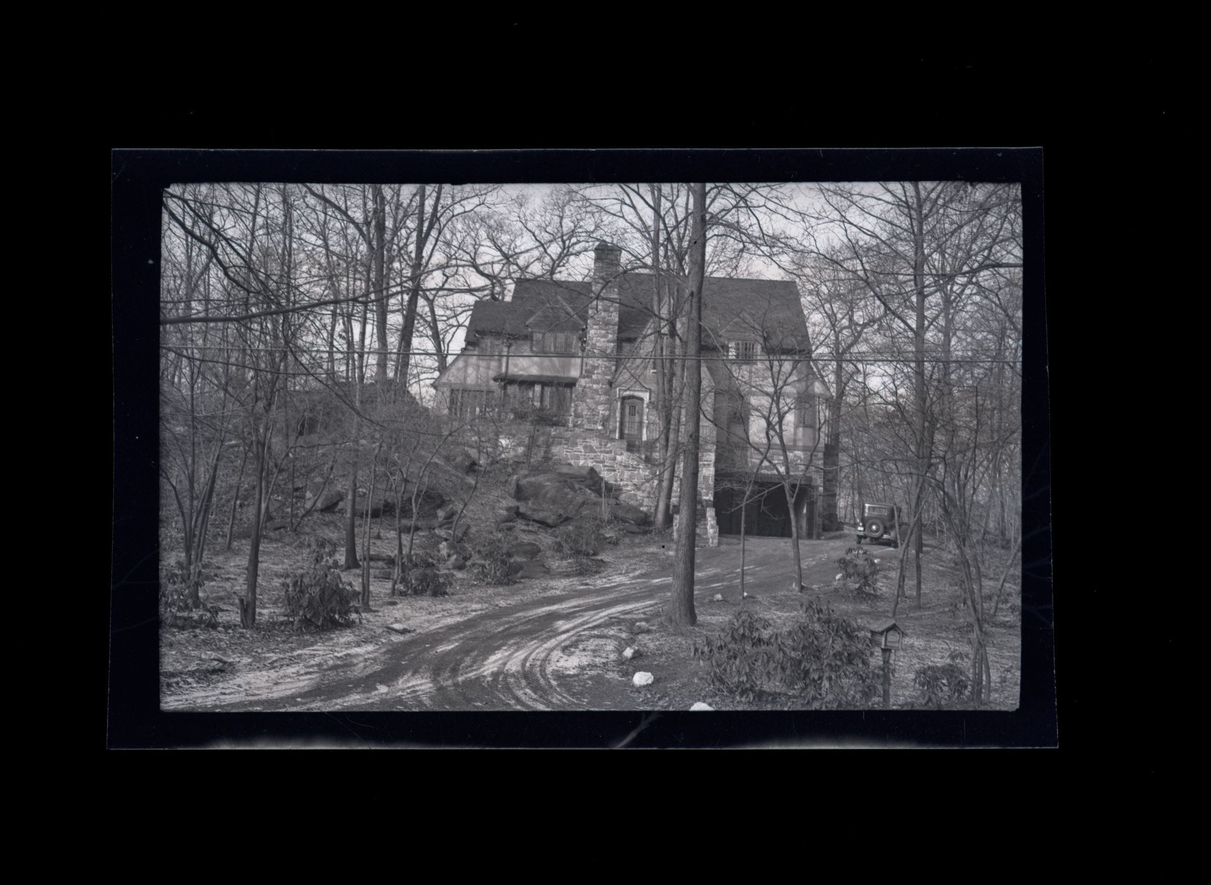 A stone and plaster-and-beam walled house with a car parked in its driveway.