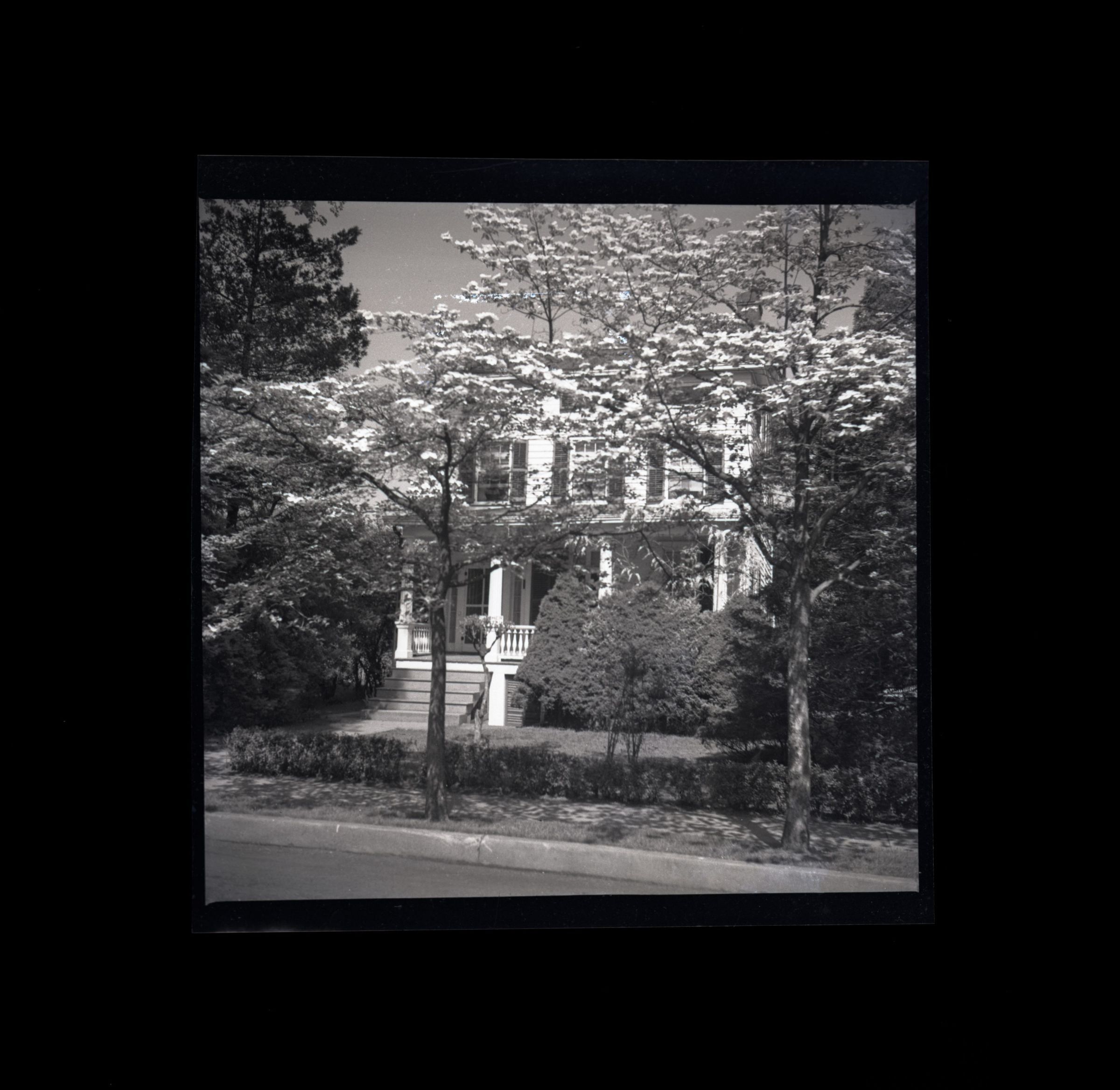 A three story house and its porch, partially obscured by flowering trees, viewed from the street.Collection