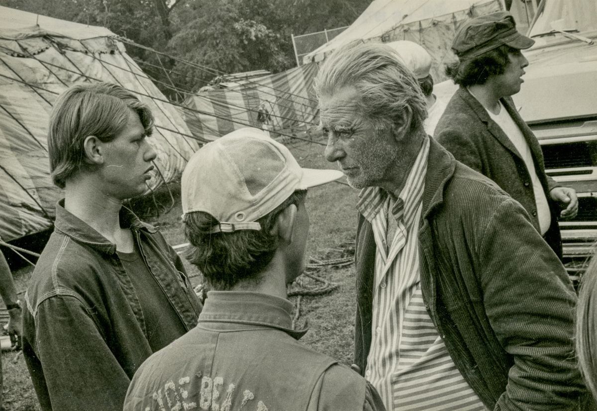 Men and elephants working to raise a large circus tent in a partially flooded field.Collection