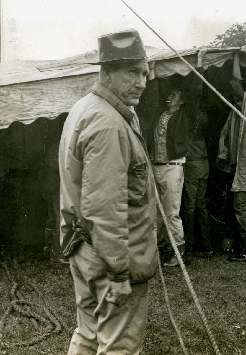Men and elephants working to raise a large circus tent in a partially flooded field.Collection