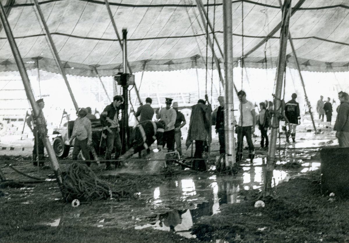 Men and elephants working to raise a large circus tent in a partially flooded field.Collection