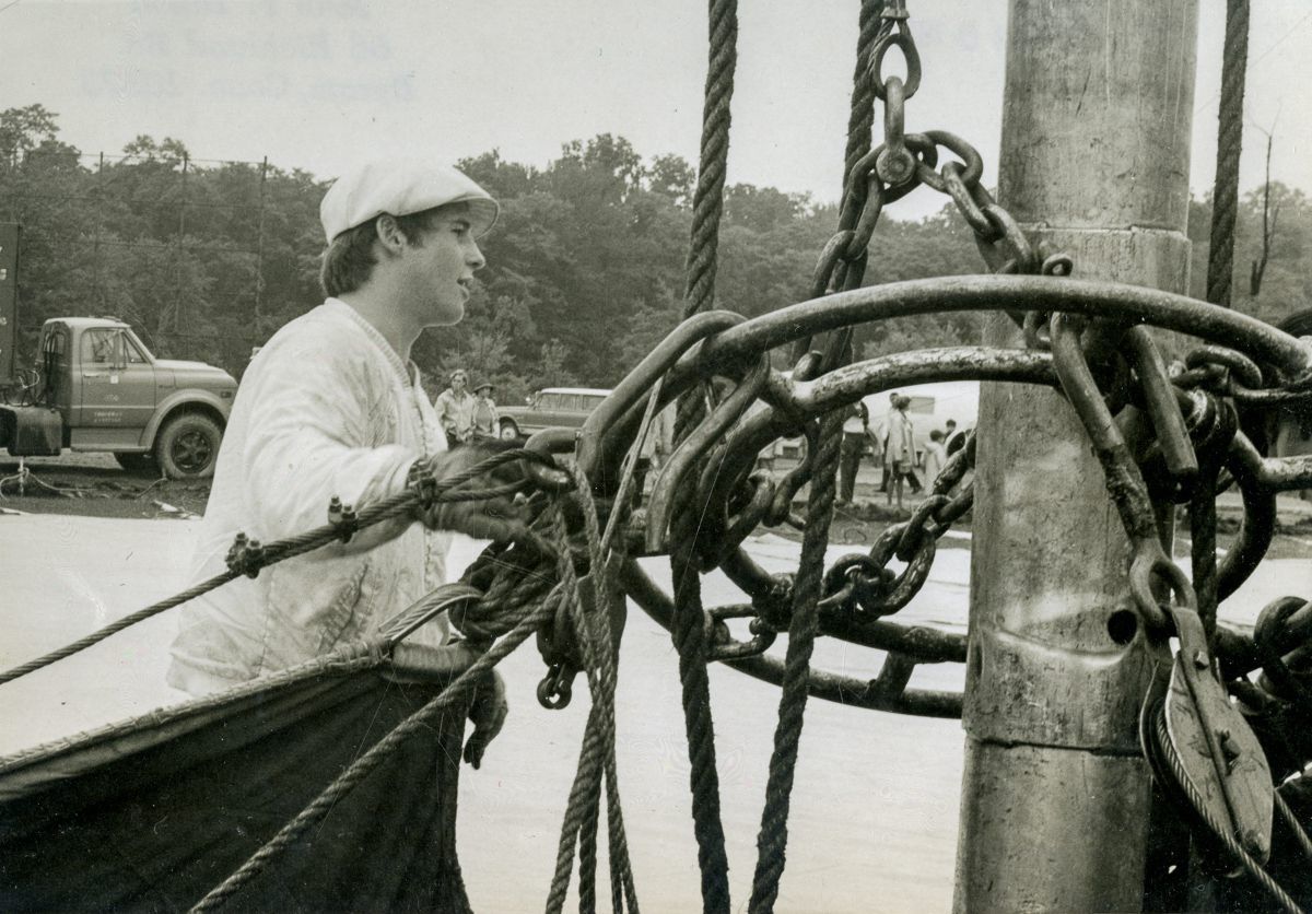 Men and elephants working to raise a large circus tent in a partially flooded field.Collection