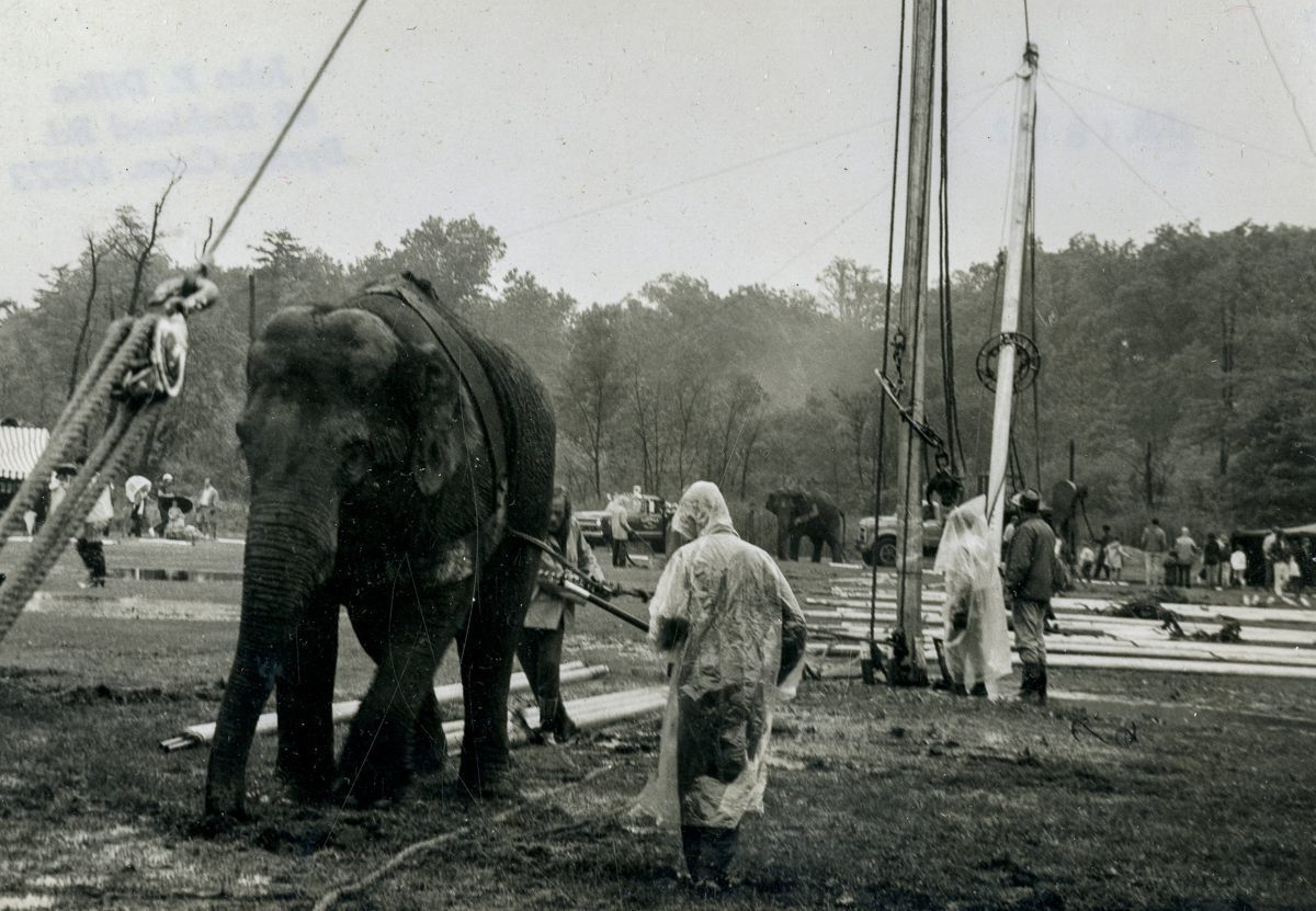 Men and elephants working to raise a large circus tent in a partially flooded field.Collection