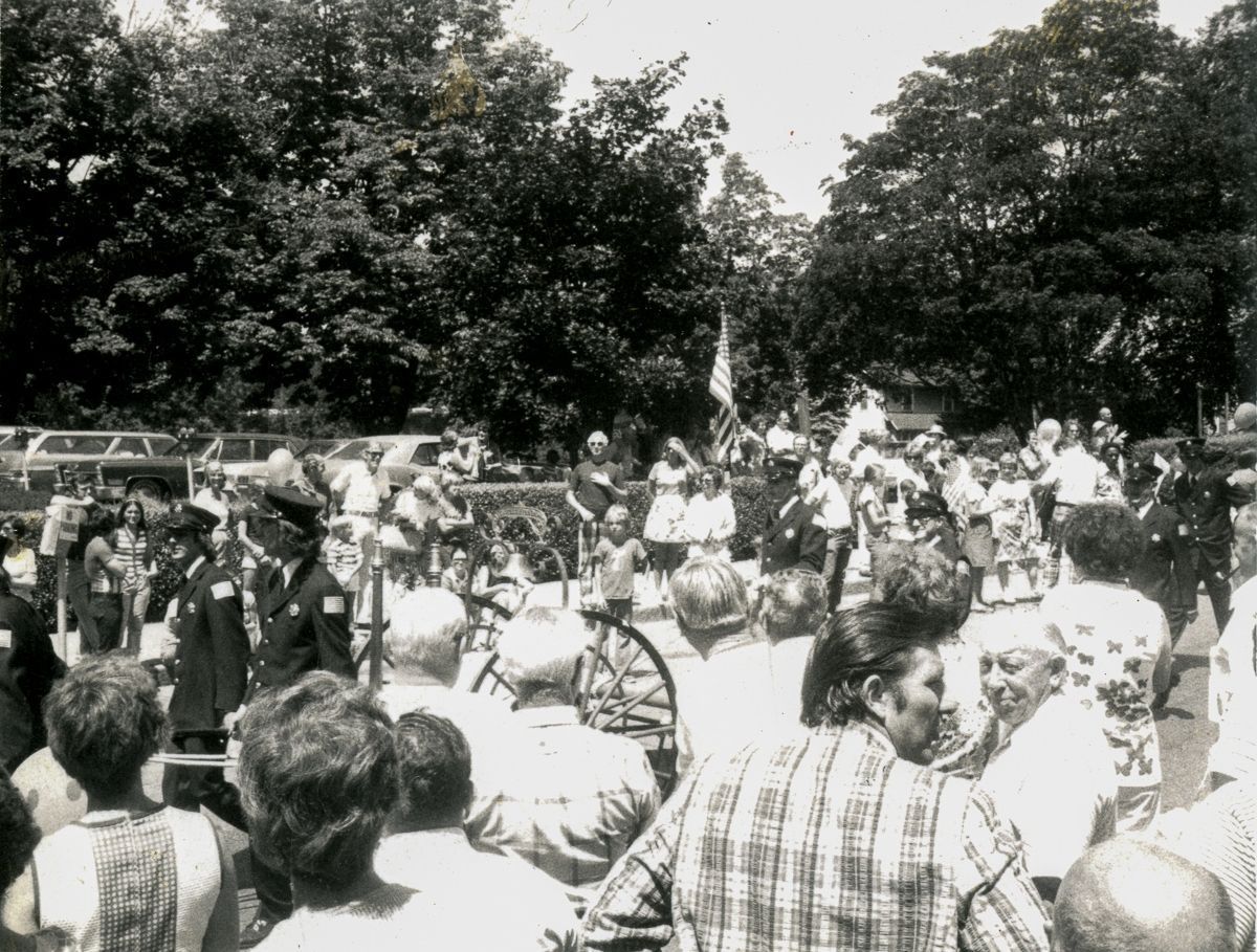 Floats, bands, and reenactors marching in a Bicentennial celebration parade in 1975.Collection