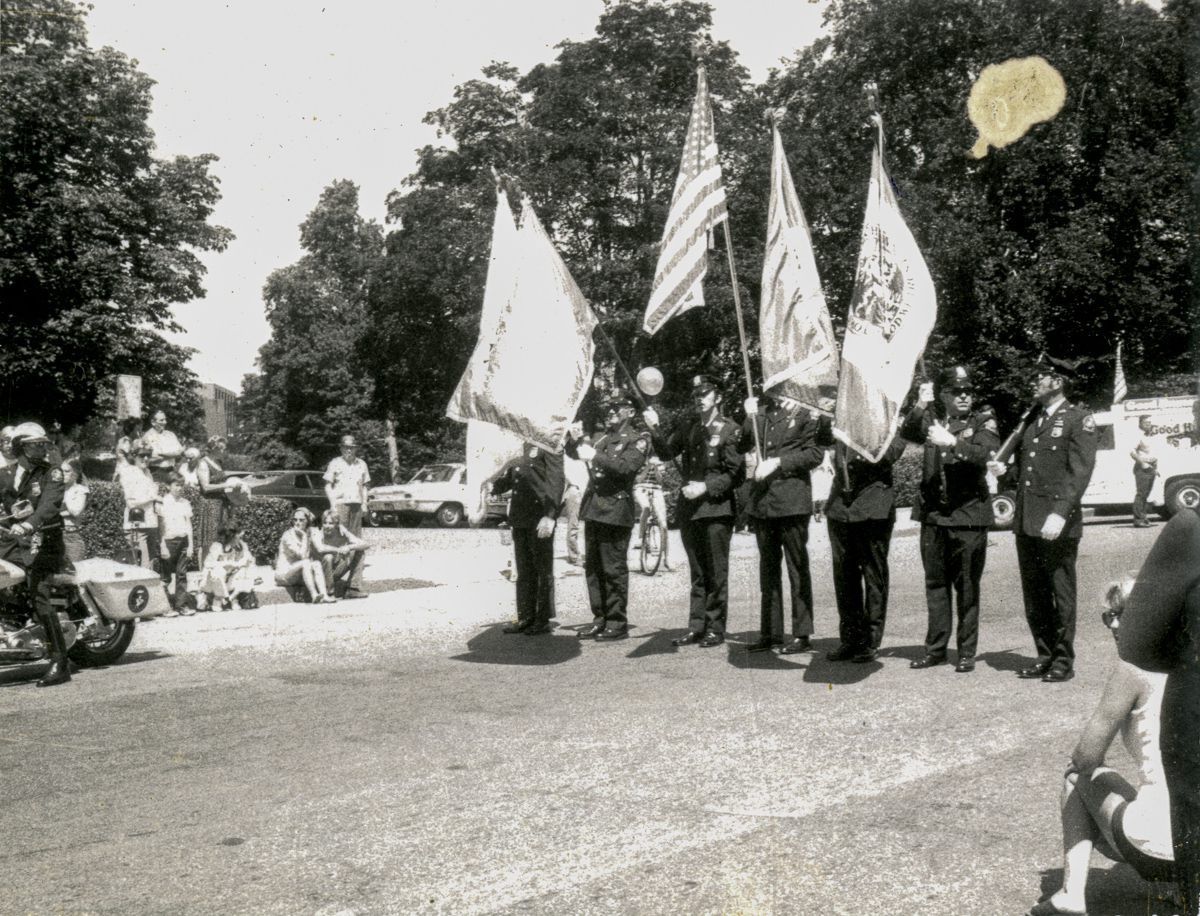 Floats, bands, and reenactors marching in a Bicentennial celebration parade in 1975.Collection