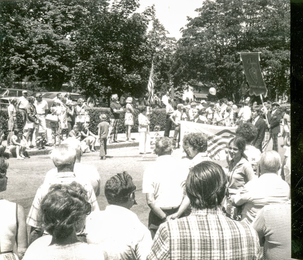 Floats, bands, and reenactors marching in a Bicentennial celebration parade in 1975.Collection