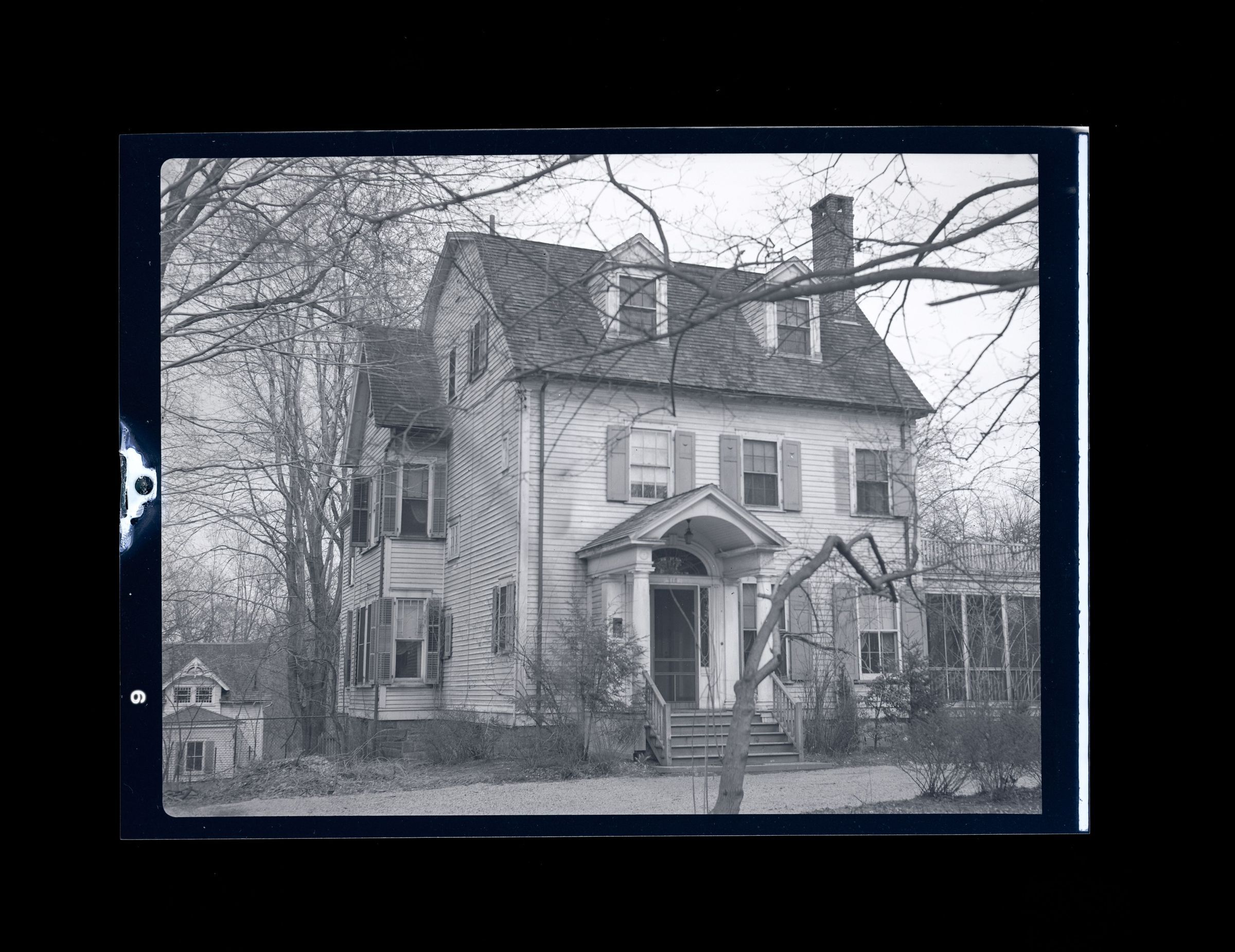 A three story house with two small dormers at the top of the house and a portico over the front door.Collection