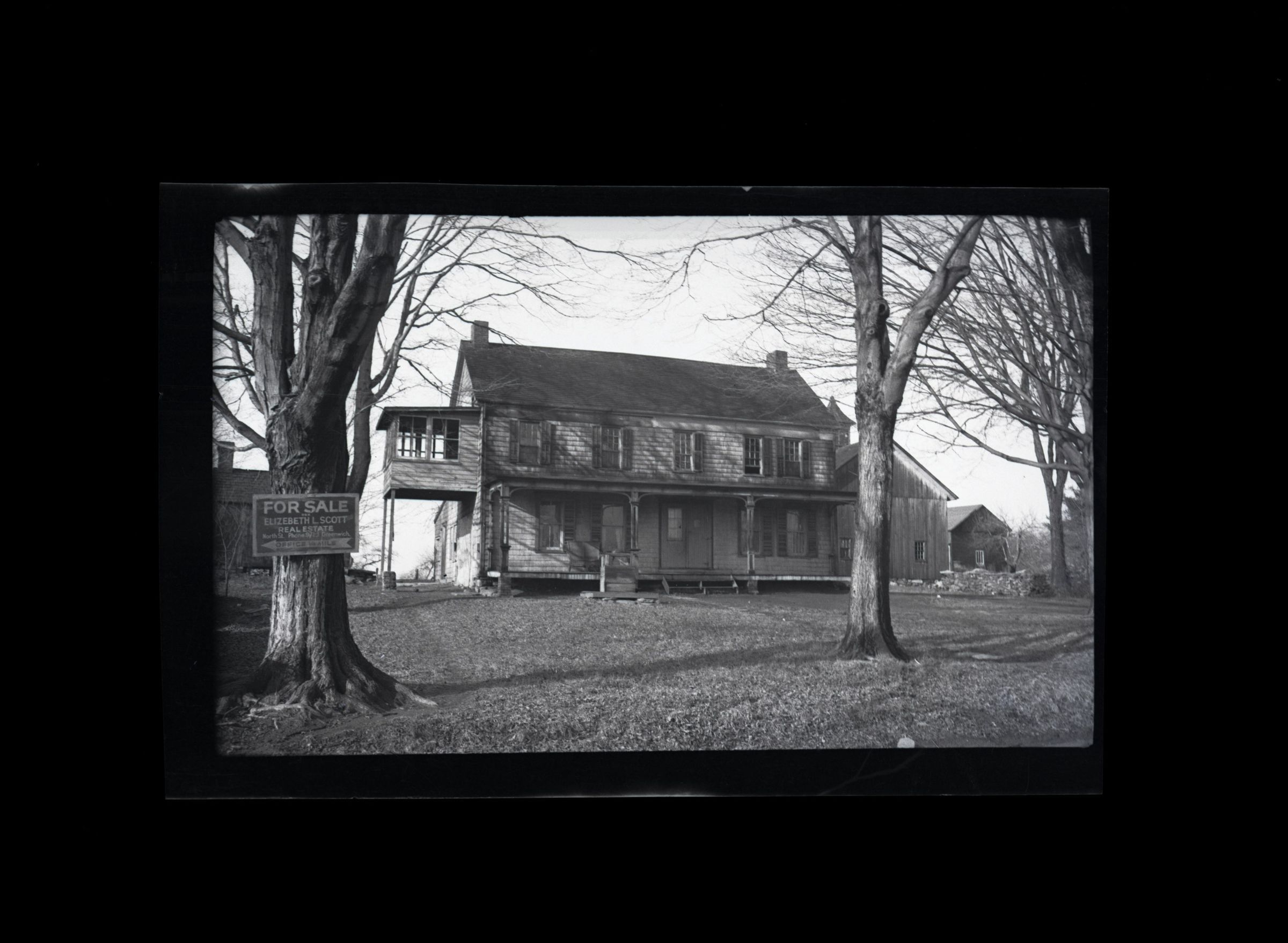 A two story, shingle house with a protruding room held up by two thin posts on the left side of the image. A barn is visible in the back right of the image.Collection