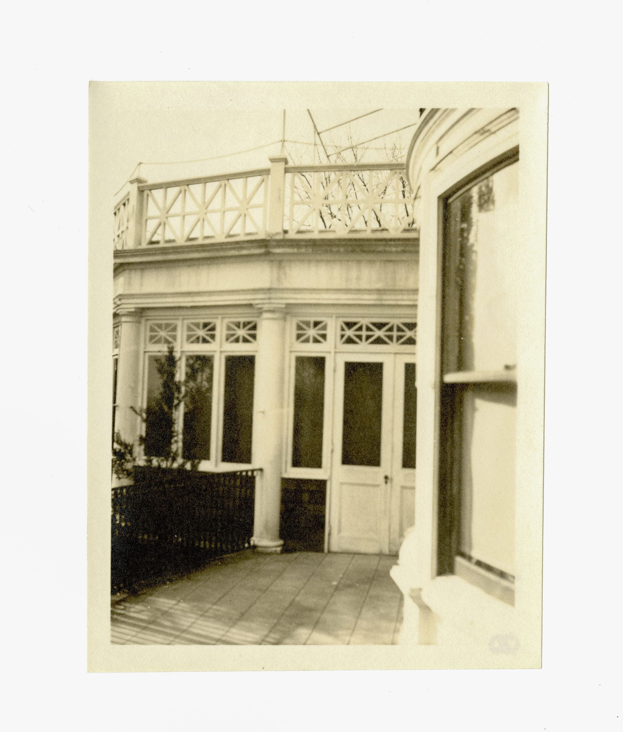 A view of a side door of the residence with a decorative banister on the platform over the room the door leads into.Collection