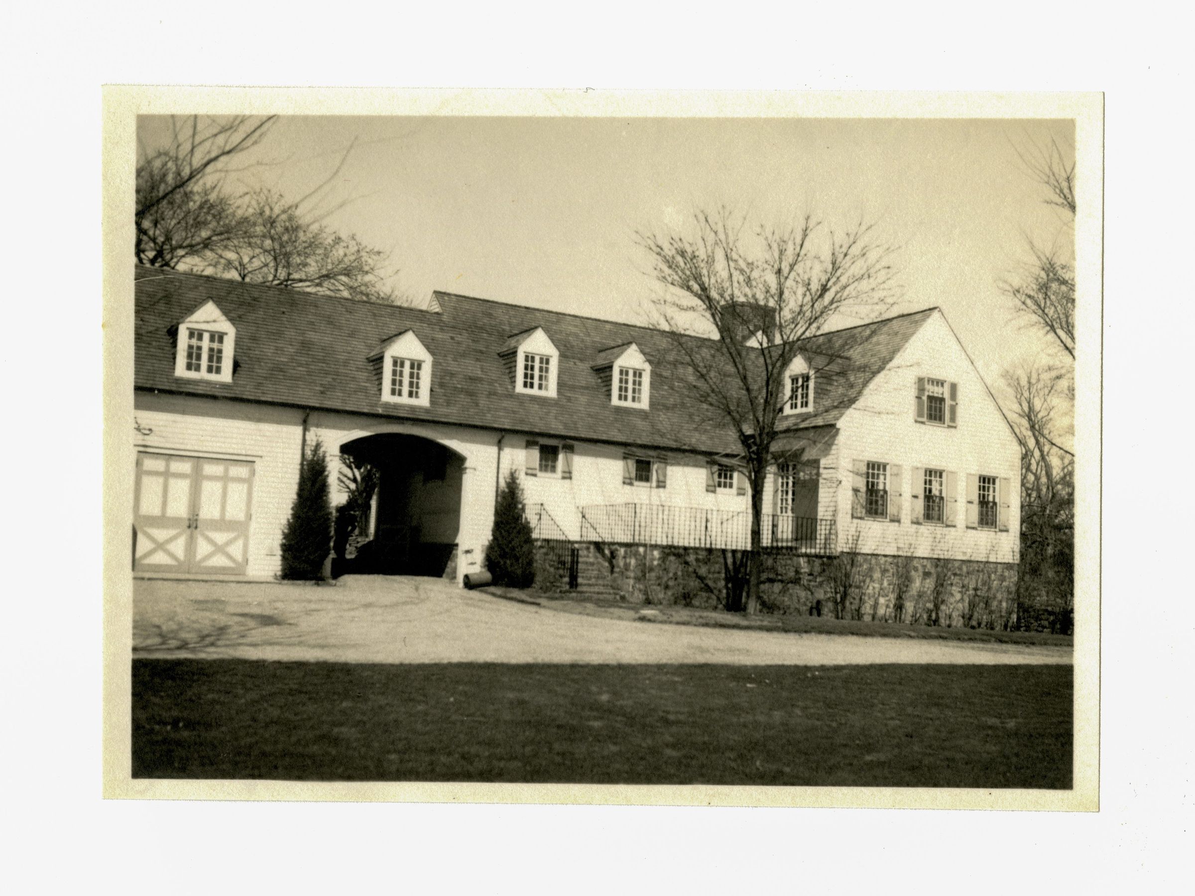 A two story house with dormers viewed from its driveway.