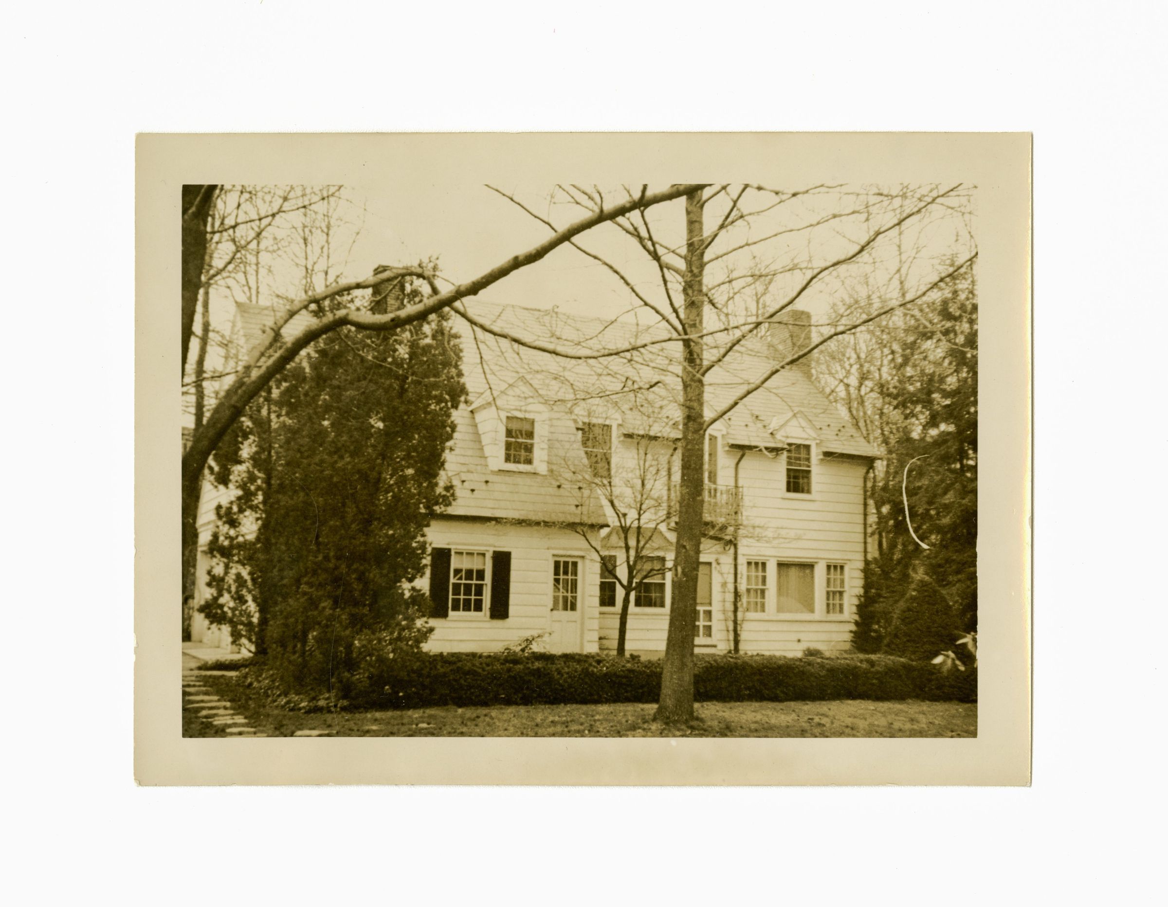 A two story clapboard house.