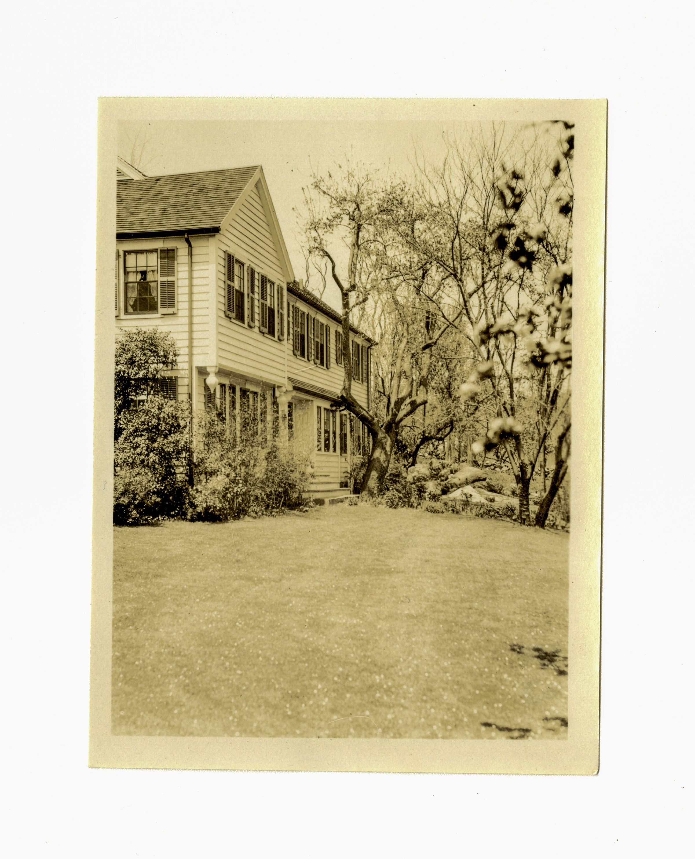 The back of a three story clapboard house and its lawn.