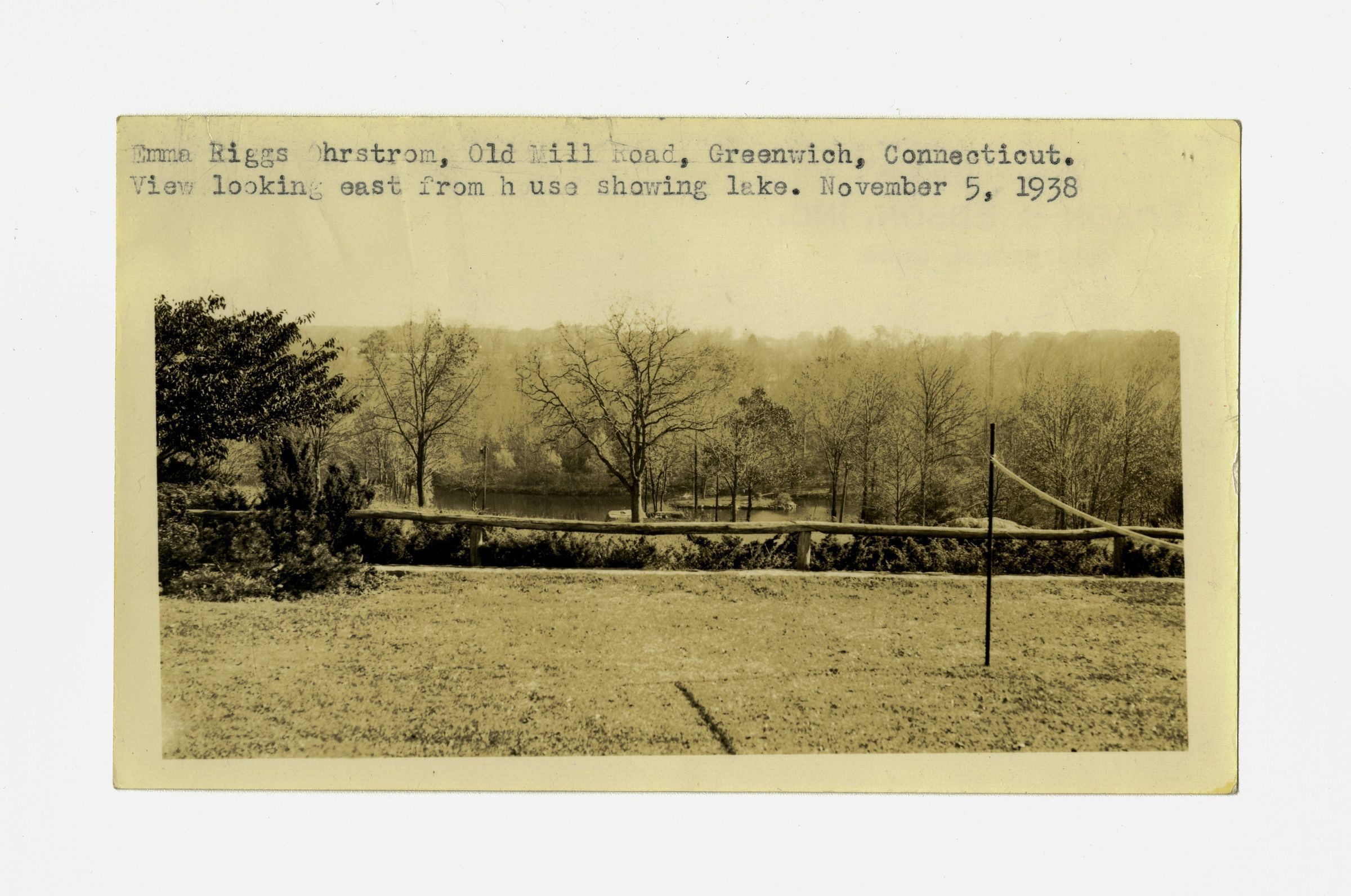 A photo from the grounds of the house looking east towards a wooded area and lake at the bottom of the hill the house is on.Collection
