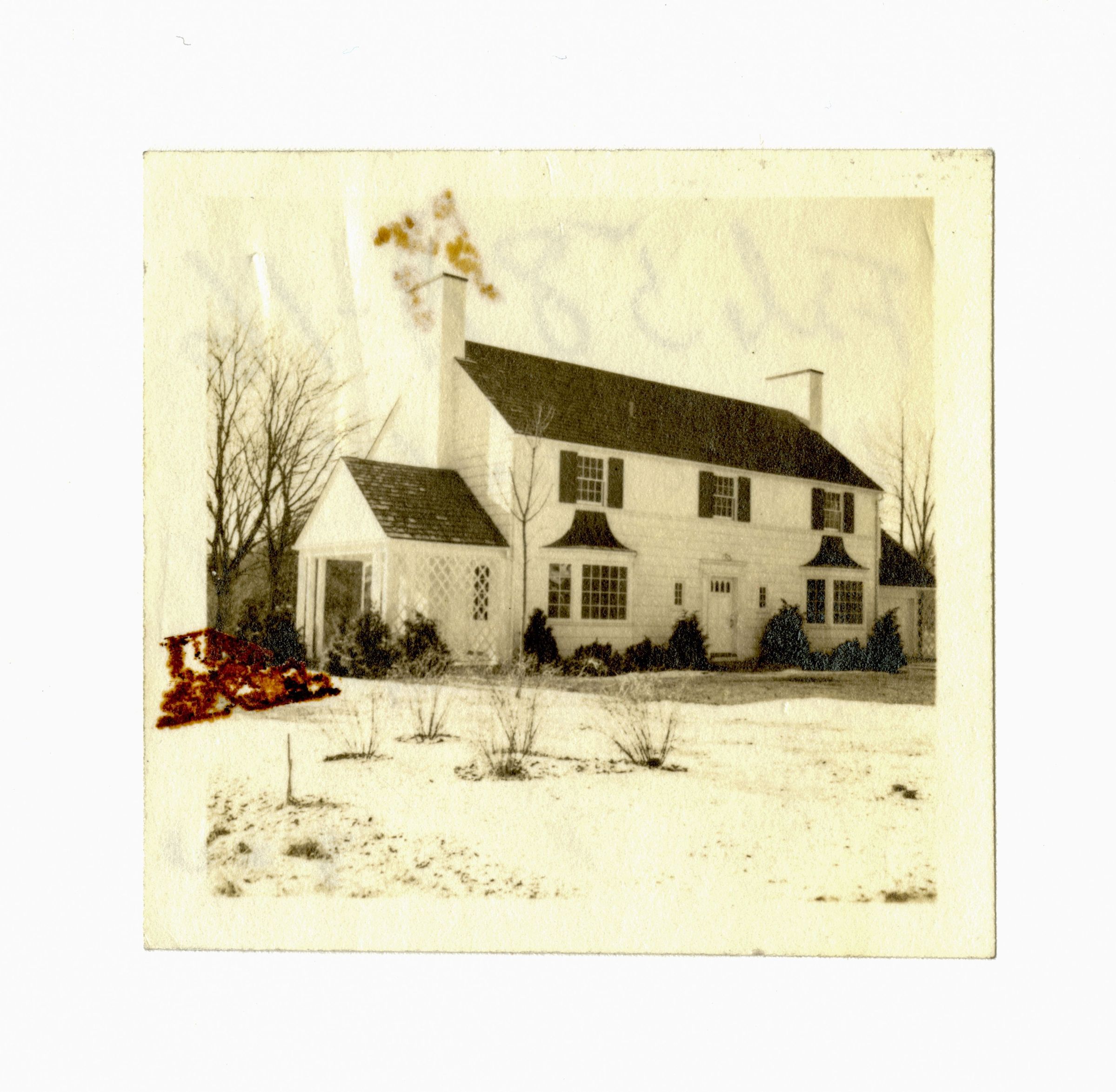 The front and side of a two story house with two bay windows.