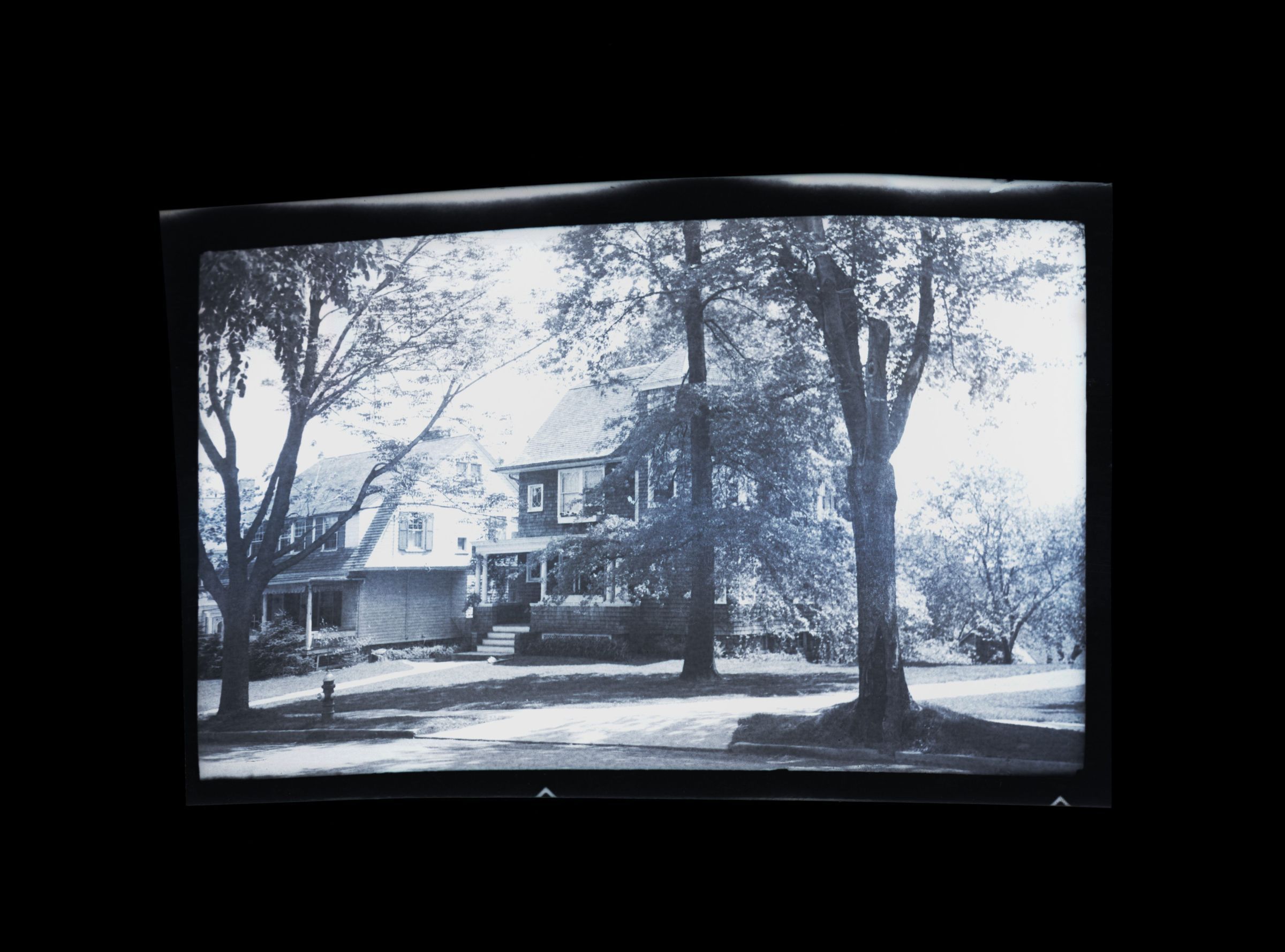 A three story shingle house, partially obscured by a tree in its front lawn, viewed from the street.Collection