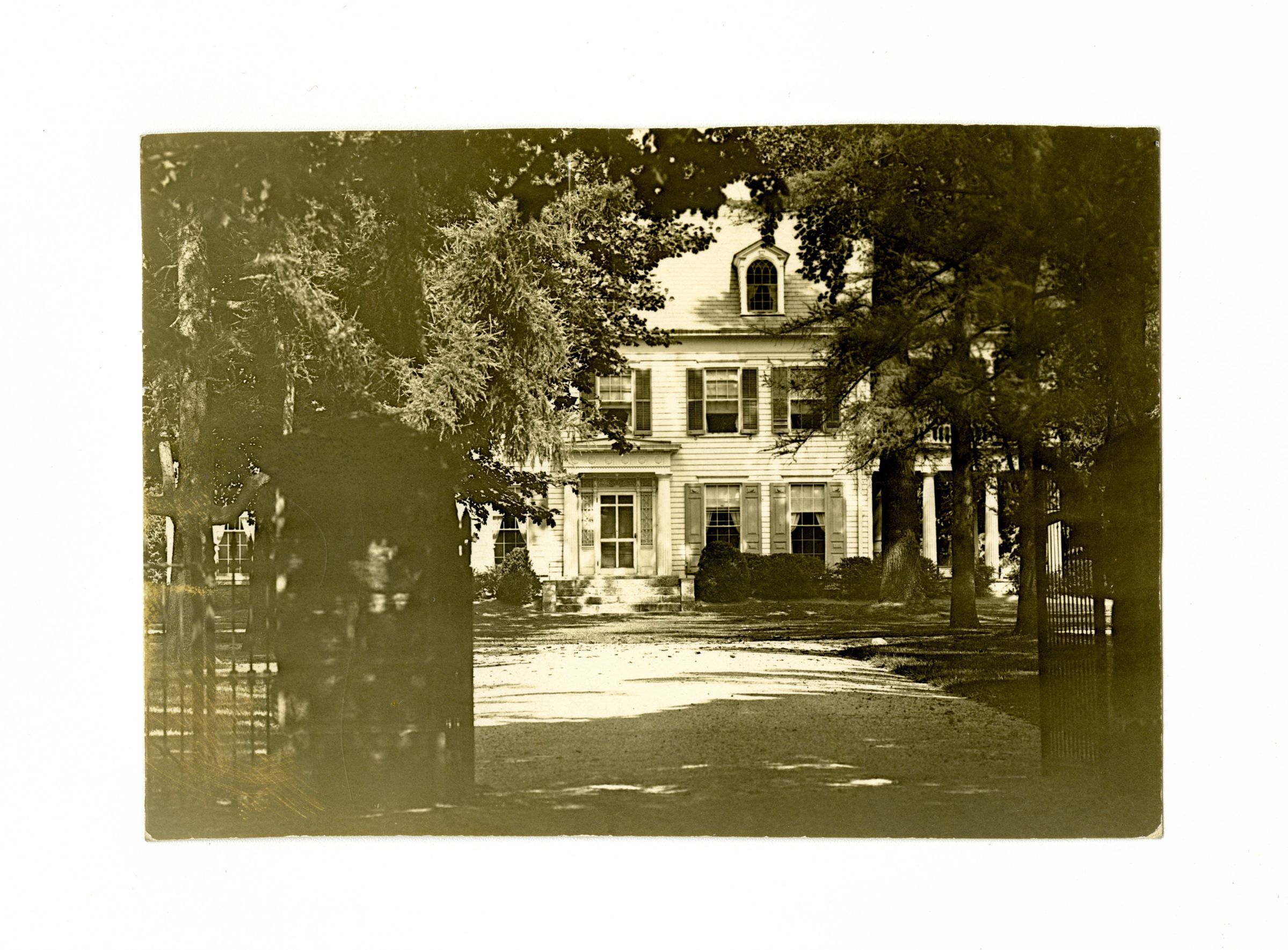 A view of the front of a three story house from the gated entrance to its driveway.Collection